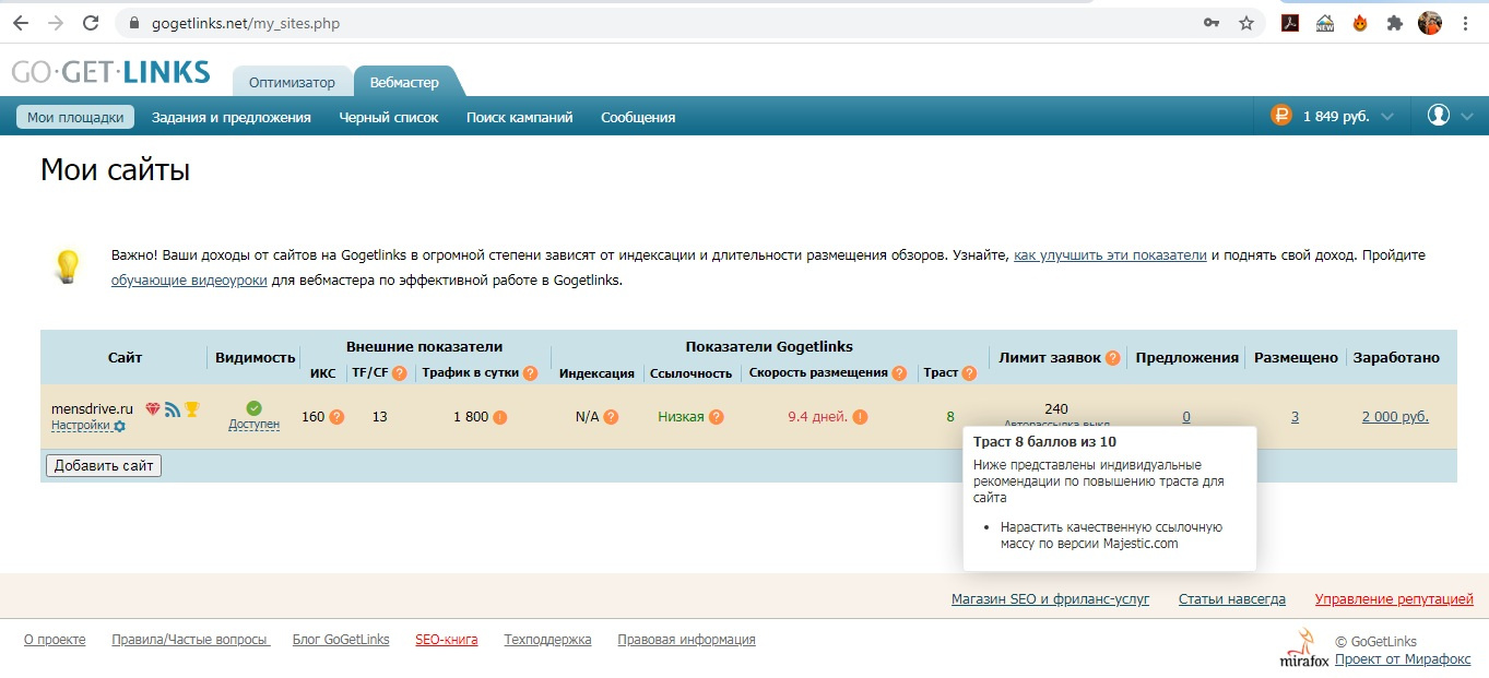 На данный момент сайт монетизируется в РСЯ, GoGetLinks, Miralinks, Luckyads.