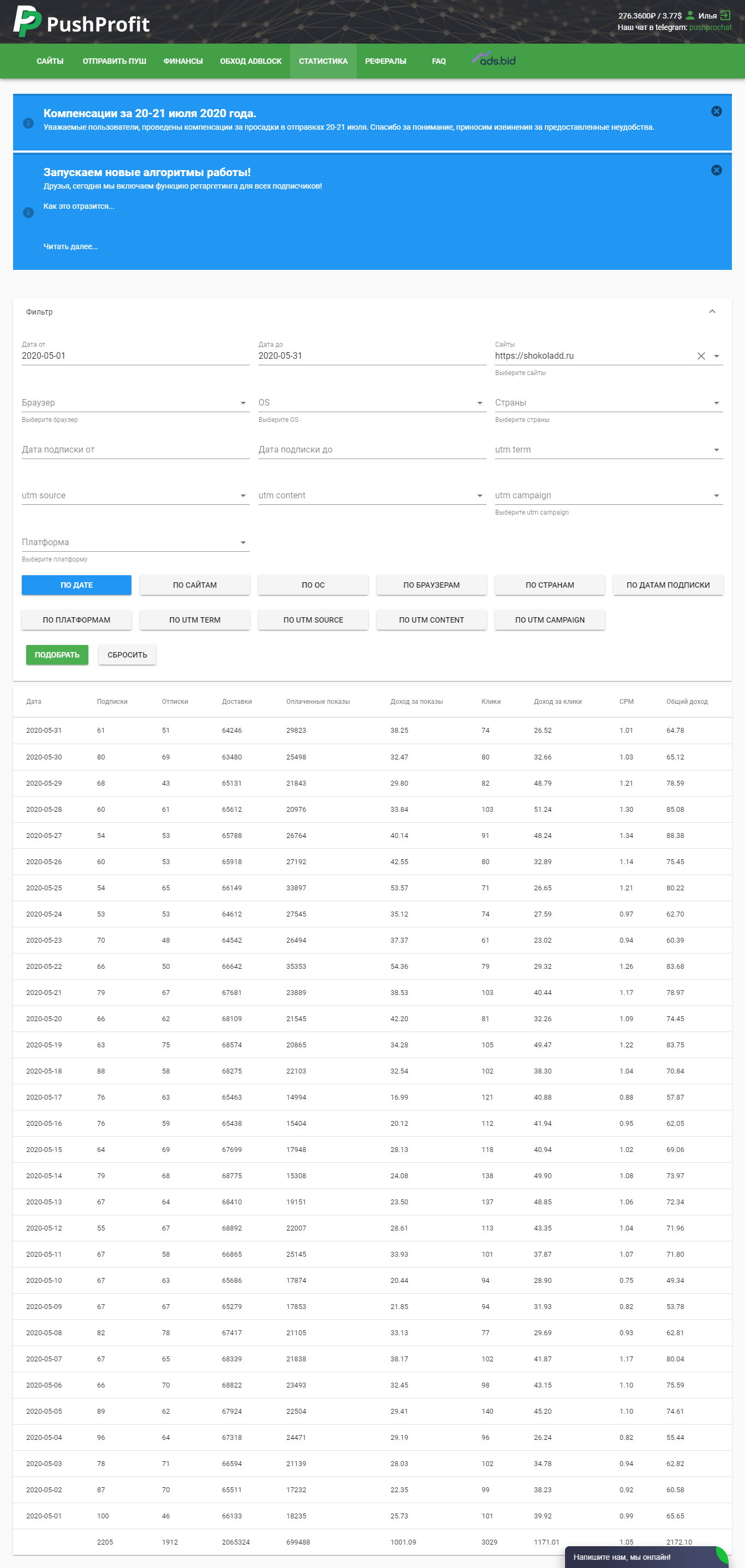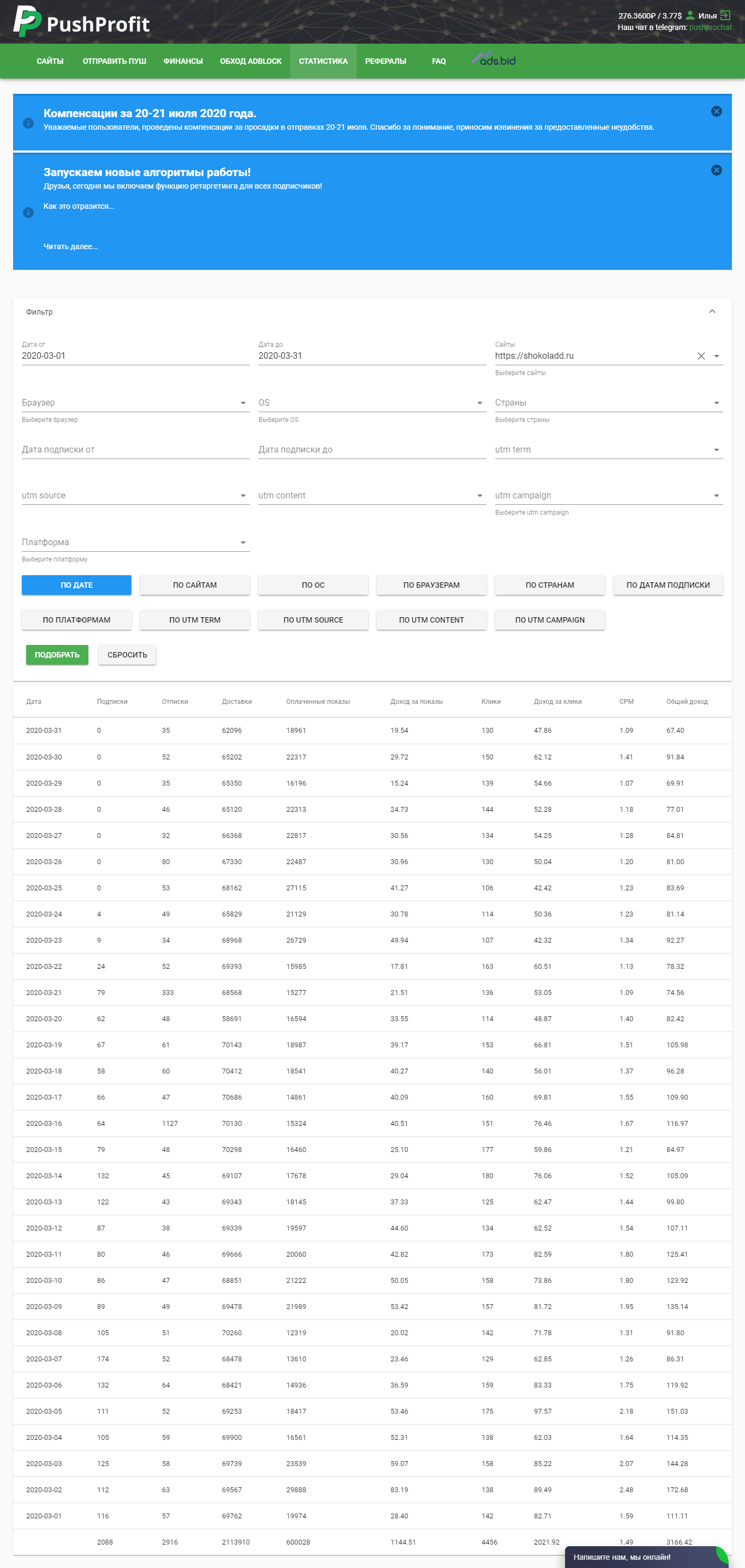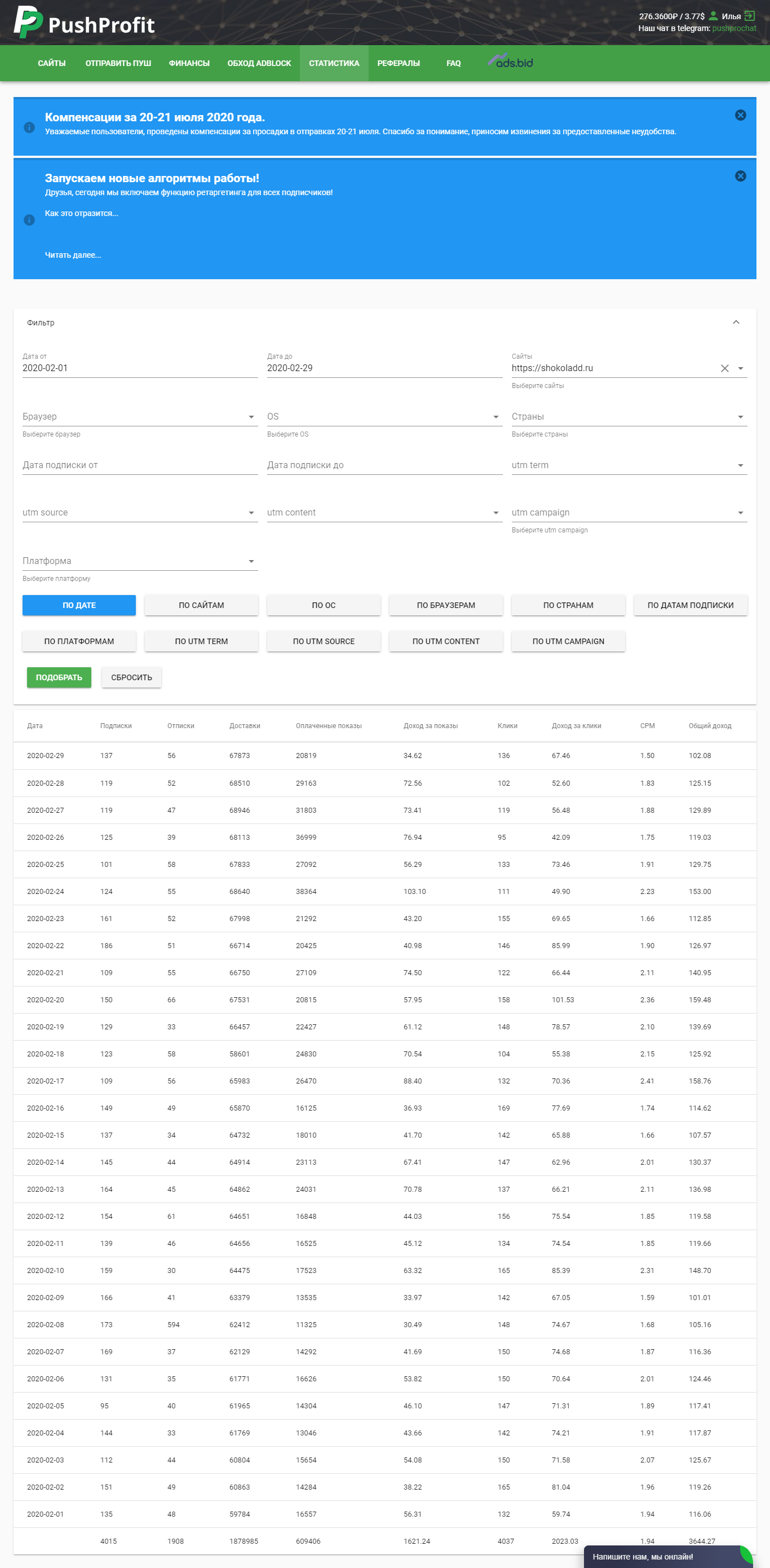 Источники дохода – Adsense, РСЯ, Ads.Bid, PushProfit. Доход на уника составляет около 10 копеек. В PushProfit есть база из 11 000 активных подписчиков.