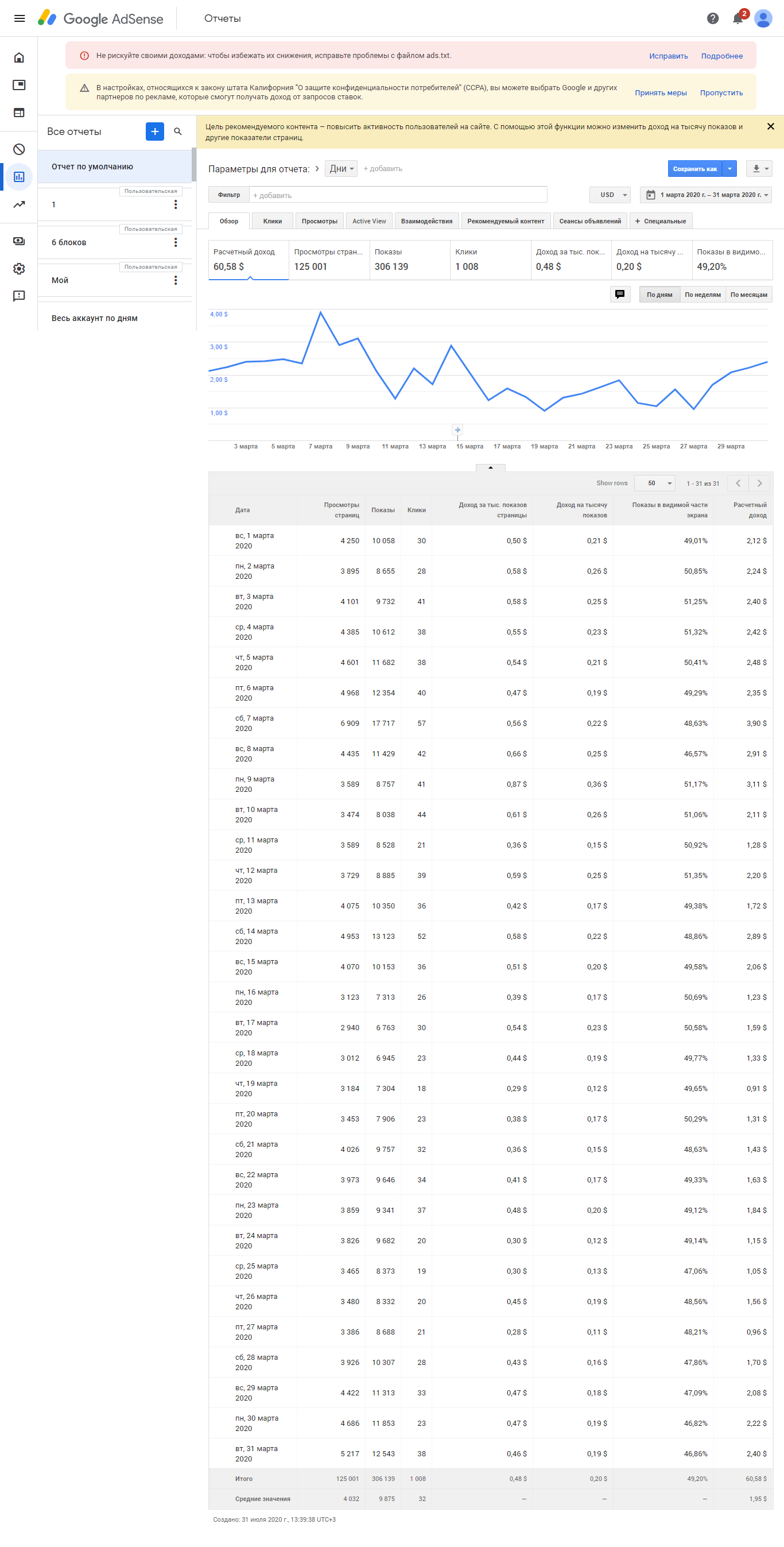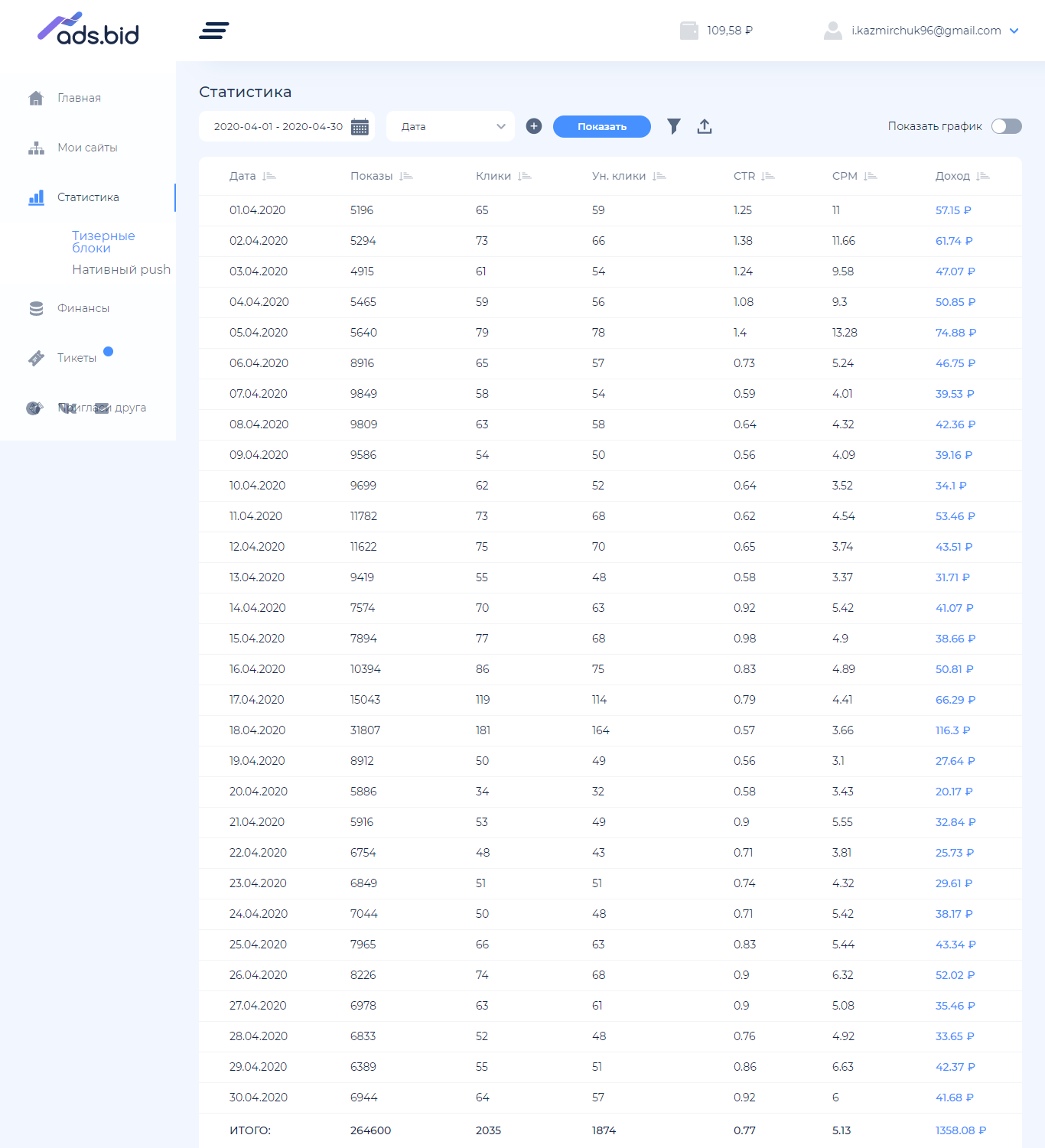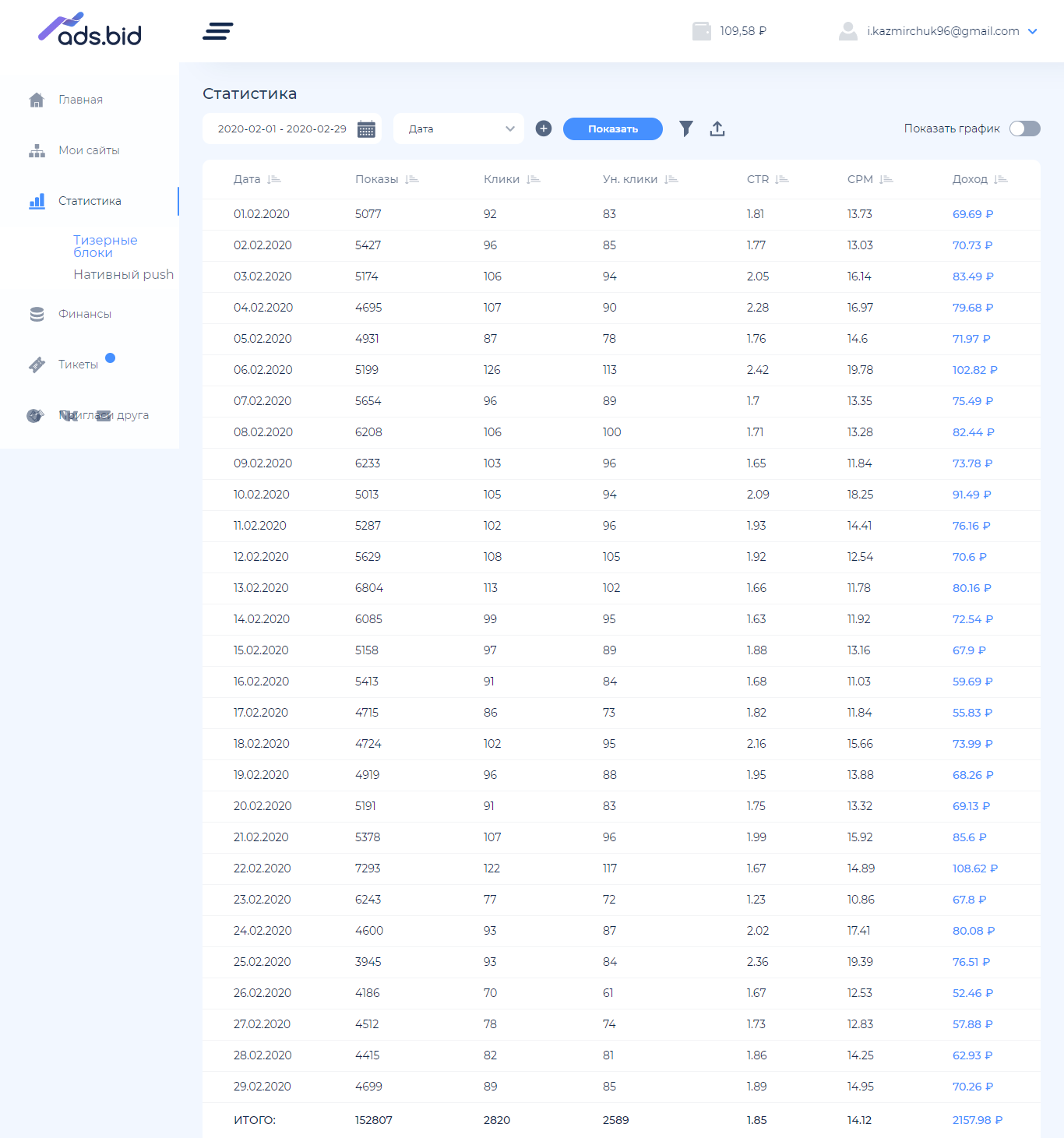 Источники дохода – Adsense, РСЯ, Ads.Bid, PushProfit. Доход на уника составляет около 10 копеек. В PushProfit есть база из 11 000 активных подписчиков.