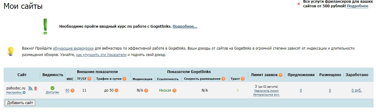 Также сайт добавлен на биржу GoGetLinks заявки приходят, но я не размещаю. Цена за 1 заявку стоит 250 рублей.