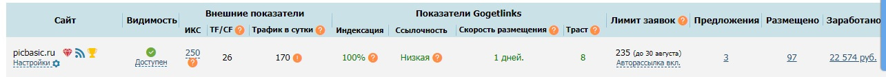 ИКС 250, TF/CF 26, в ГГЛ траст 8. Обращаю Ваше внимание, что данный сайт зарегистрирован в ГГЛ в очень редкой и профитной тематике: Производство – Электроника и электротехника (можете посмотреть, сколько площадок есть в данном разделе). Вот что сам ГГЛ пишет об этом у себя в блоге http://joxi.ru/v29kX5VtzaLezr