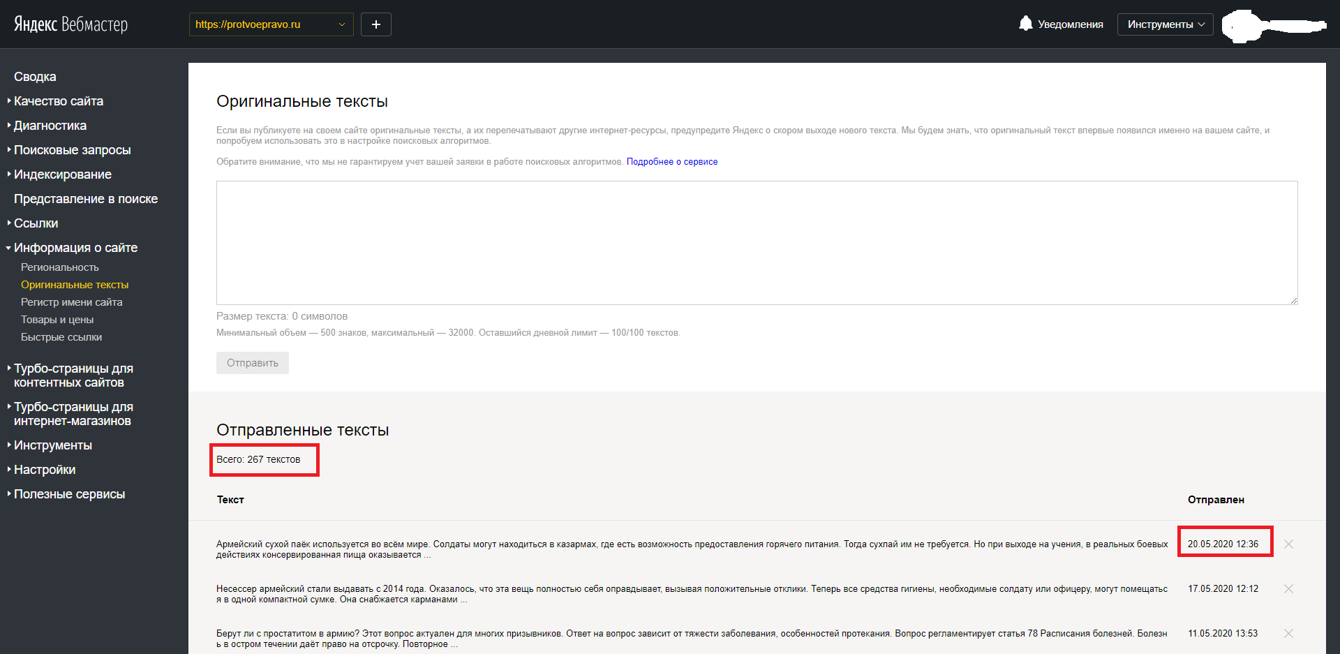 СДЛ со статьями для действующих военнослужащих, пенсионеров и призывников. Абсолютно белый проект, созданный с нуля. Домен ранее не регистрировался. Запуск сайта был 11 января 2019 года. Выписаны тематические статьи из топ-5 конкурентов. Размещено 267 статей, все занесены в уникальные тексты Яндекса.