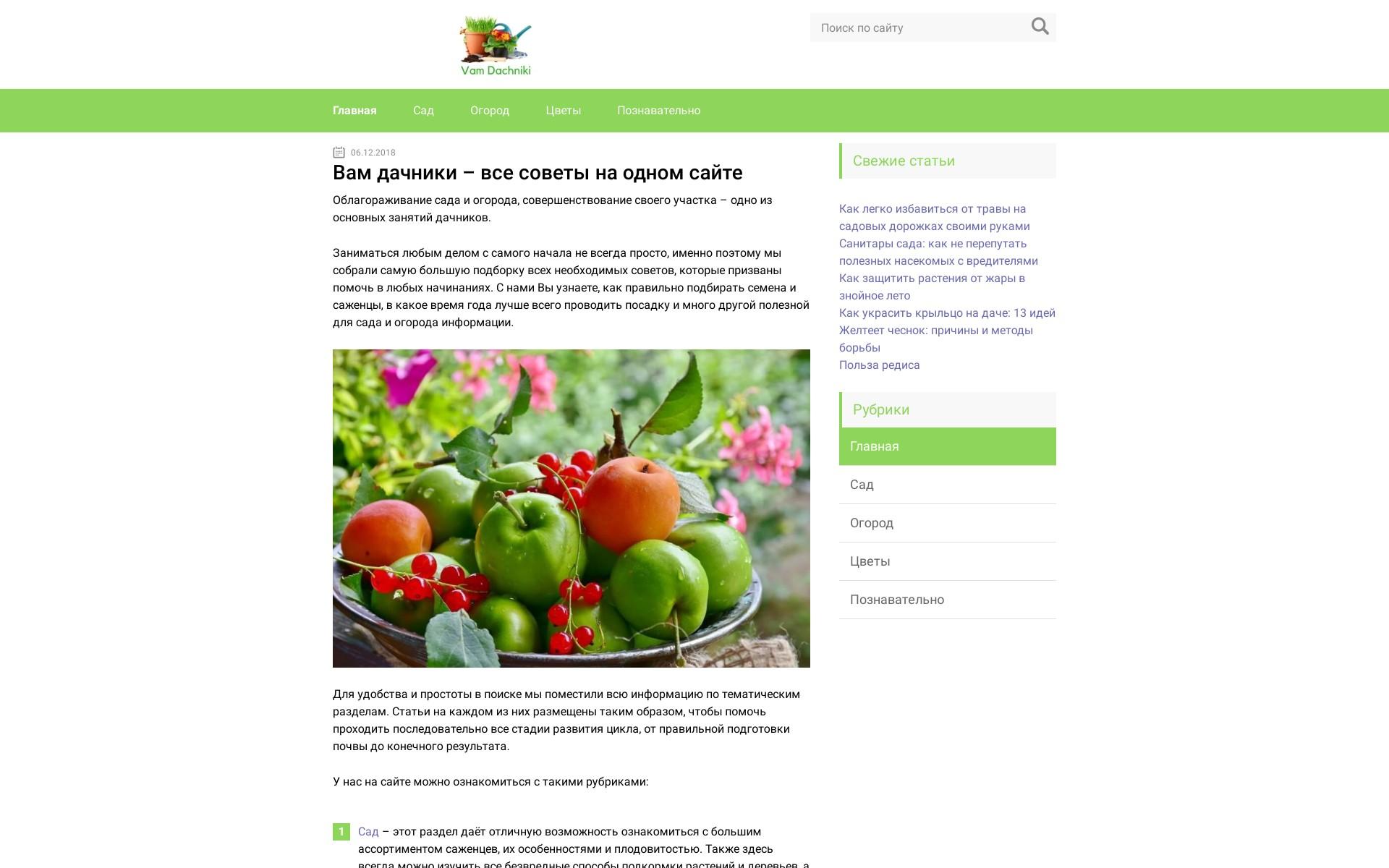 Старый сайт огородной тематики. Первая статья была опубликована в 2013 году. Сейчас на сайте 54 статьи.
