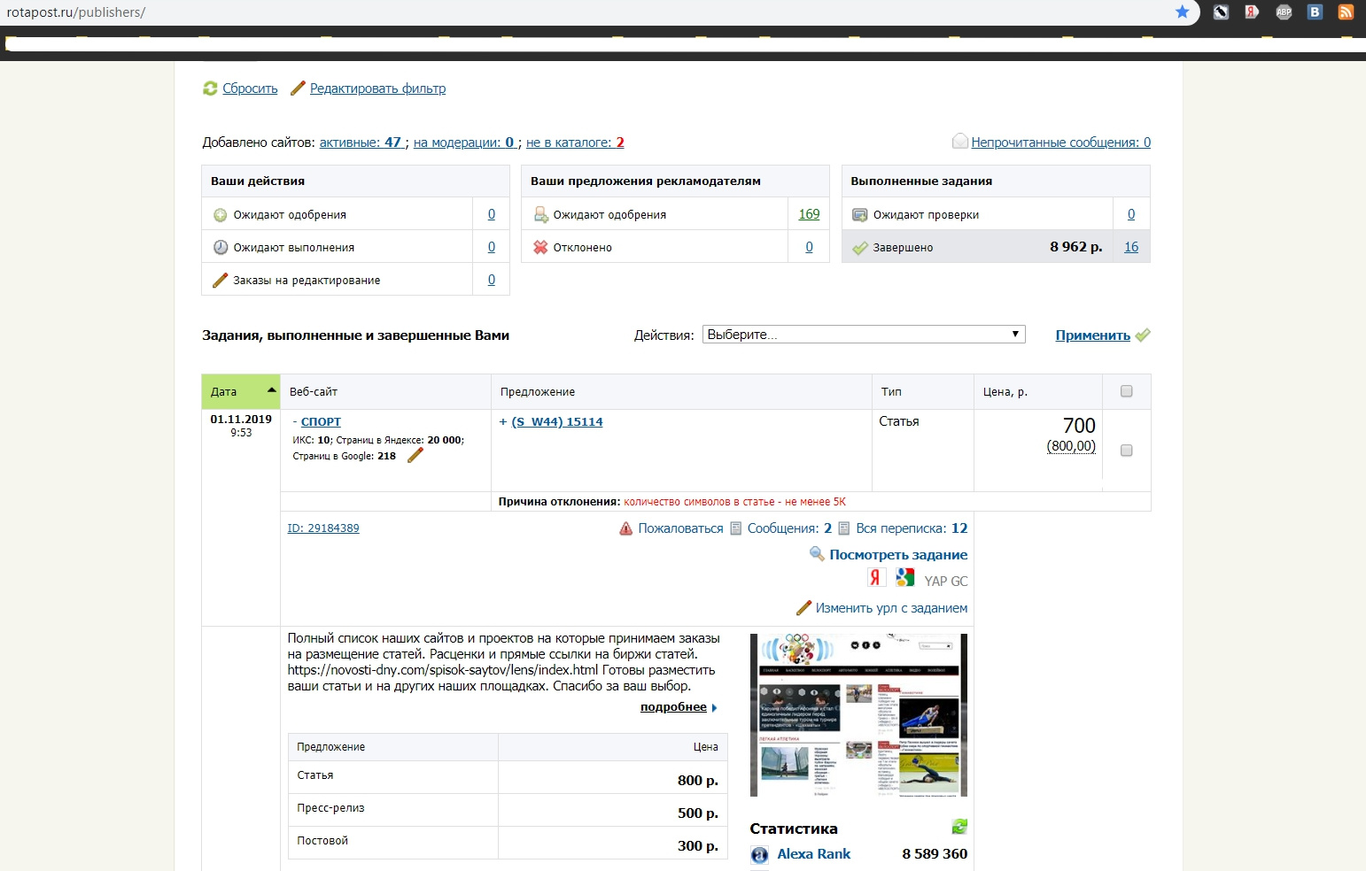 Сайт работает на биржах которые приносят стабильный доход, так же есть прямые заказчики на публикацию статей, постов, ссылок, баннеров на сайте. Данные люди связываются на прямую с администрацией сайта..