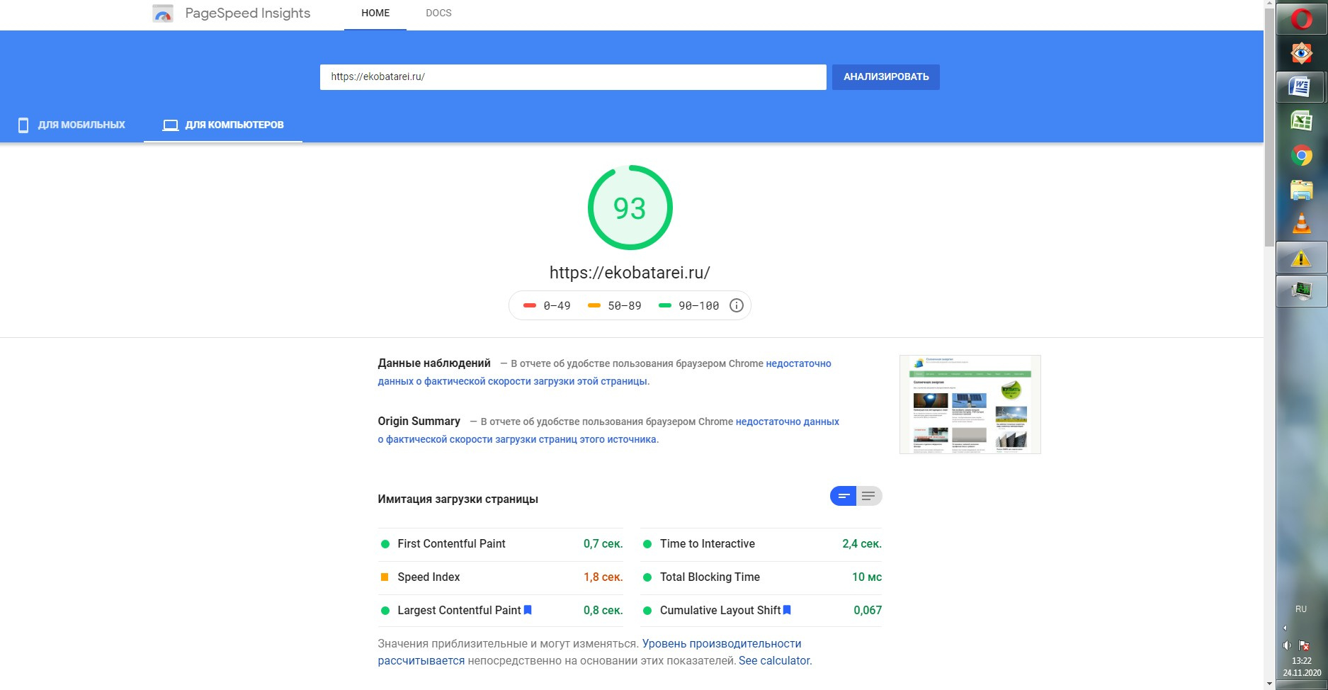Результат: https://developers.google.com/speed/pagespeed/insights/?url=https%3A%2F%2Fekobatarei.ru%2F&tab=desktop