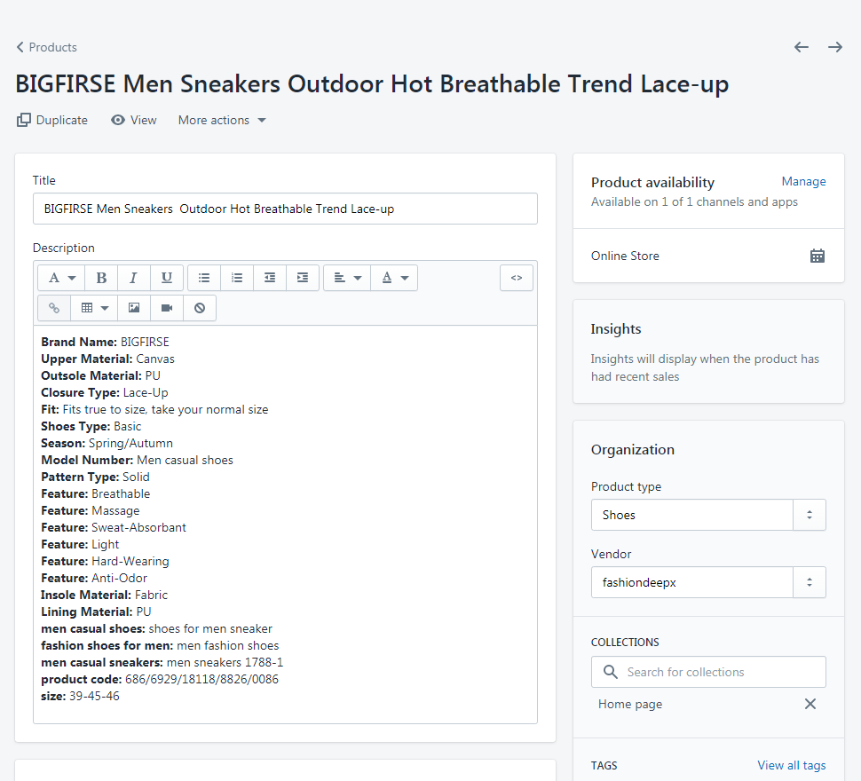 Это предварительно созданный магазин обуви с прямой доставкой с заполненным каталогом продуктов, + предварительно настроенными плагинами, включая уведомления о корзинах, автоматическую прямую доставку с помощью Oberlo, приложение Push Notification и многое другое.