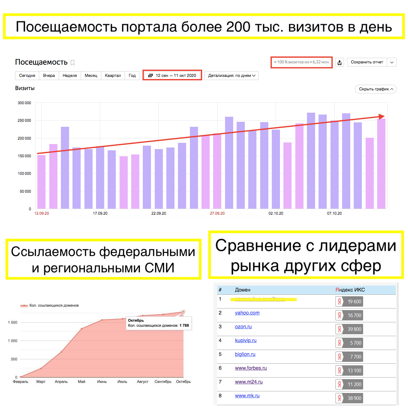 2) Ссылаемость крупнейшими СМИ России: ИКС сайта - 19,600: в приложении приведено сравнение с другими сайтами, лидерами своих ниш.