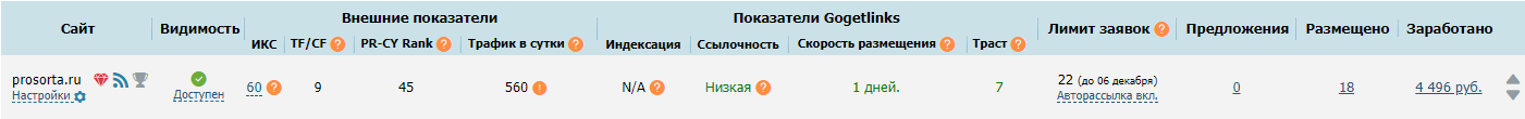 Также сайт добавил в gogetlinks, выставил самую большую возможную цену и иногда размещаю ссылки. На данный момент продано 15 ссылок на сумму 3 747 р.