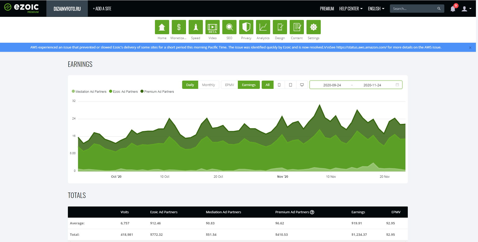 Основной партнер по монетизации: официальный партнер Гугла, компания Ezoic. РСЯ используется как минорный монетизатор.