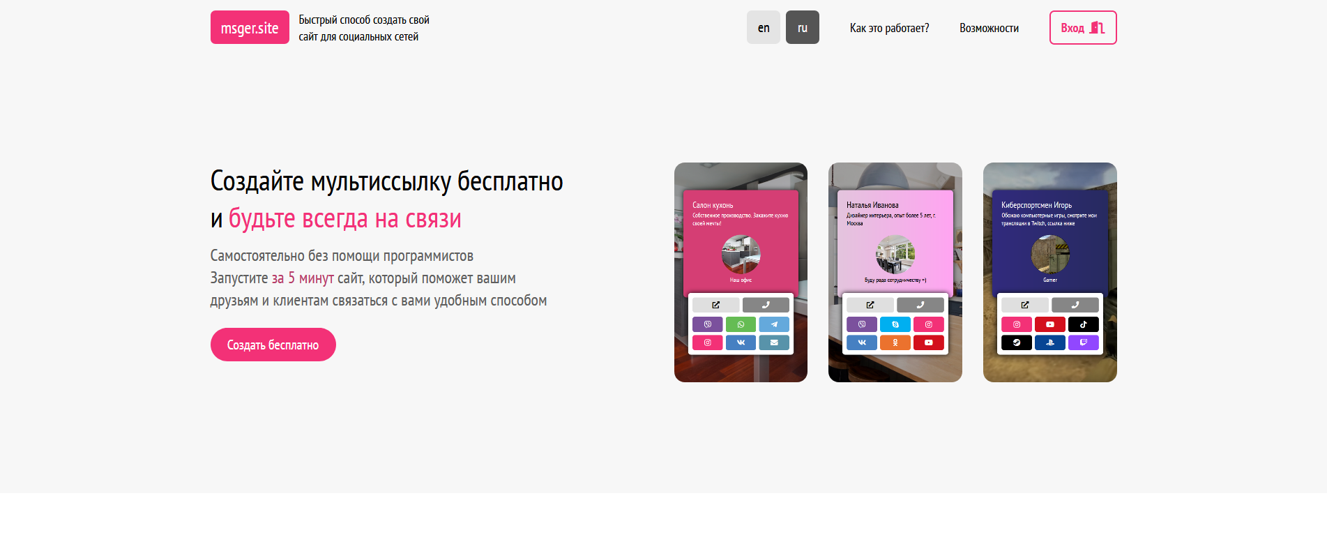 Сервис создания мини-сайтов (мультиссылок). Является аналогом таплинк, со своими особенности: каталог контактов, регистратор переходов, статистика, виджет для сайта.