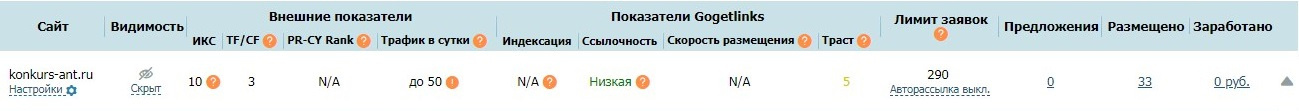 Сайт принят в биржу ссылок Gogetlinks. За все время на сайте размещено 33 ссылки в ГГЛ, ссылочность низкая. Параметры сайта в бирже ссылок на скриншотах.