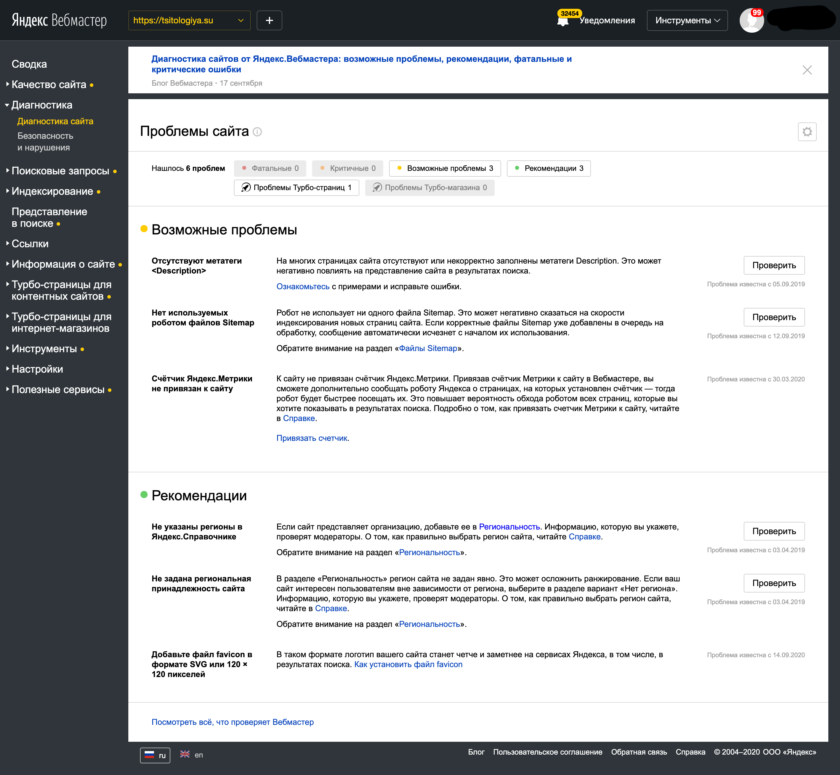 На сайте критических ошибок нет - скриншот с Яндекс.Вебмастер (кликабельно).