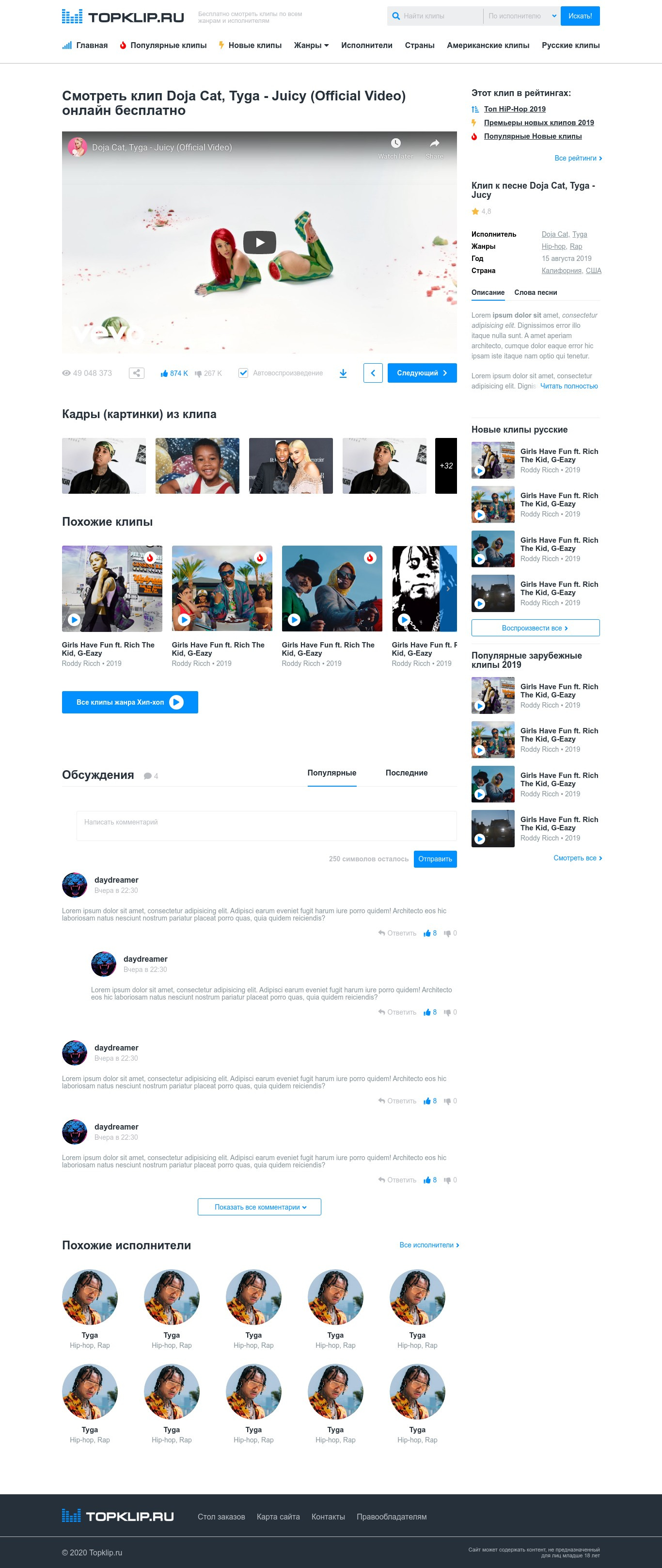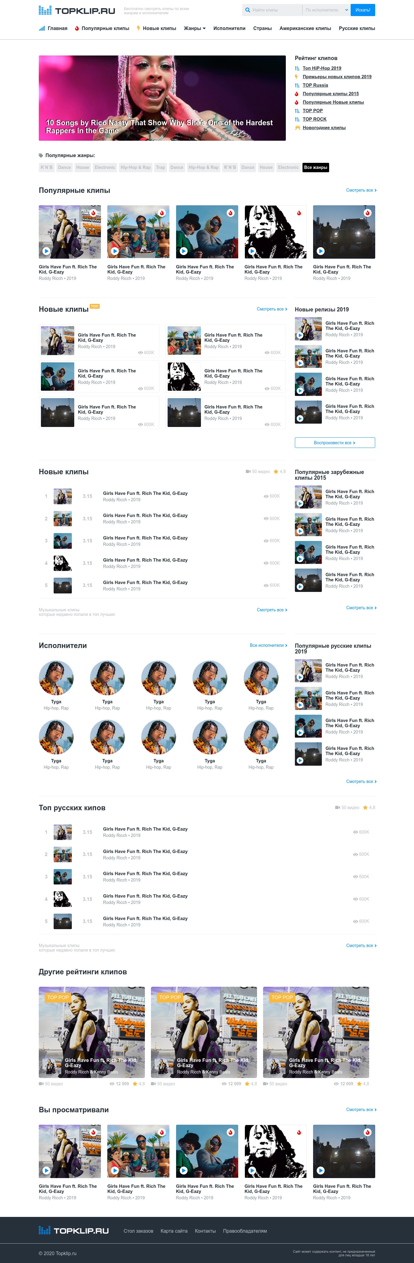 Есть готовый дизайн и верстка проекта (2.jpeg, 4.jpeg, 3.jpeg, 1.jpeg и еще несколько страниц), также весь список исполнителей отсортированный по частотности и разбит по жанрам в excel. Также уже написанный скрипт для скачивания (получения всей информации) по указанному ID клипа на YouTube, а также группы клипов исполнителя. Т.е можно добавлять исполнителей на сайт, указывать только ID-группы с канала исполнителя на YouTube и написать скрипт, который будет проверять, есть ли из списка клип на сайте или нет и создавать страницу клипа.