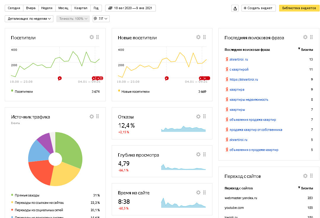 За 4 месяца сайт обогнал в выдаче Яндекс многих игроков рынка недвижимости в России и приложив немного усилий, сайт за короткий промежуток времени может выйти на первые позиции в любом городе России.