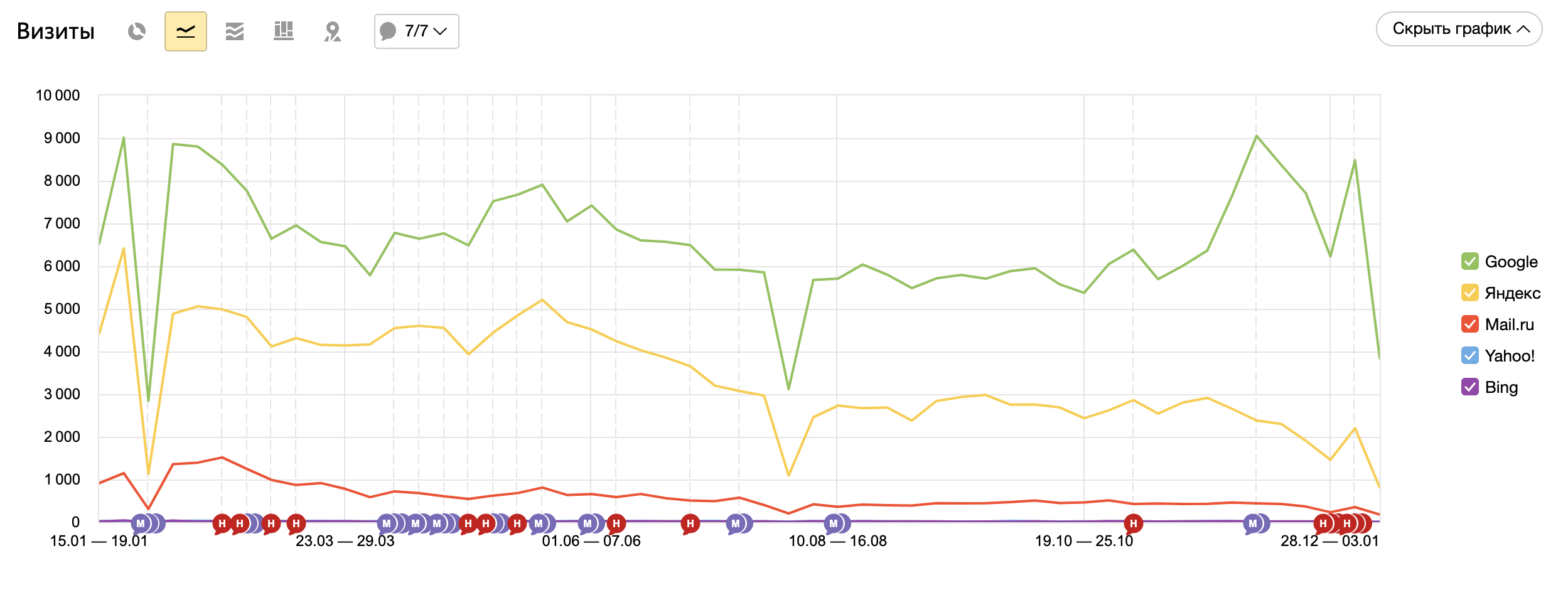 В таком случае попрошу у вас скрин с метрики."отчеты" - "источники" - "сводка" за квартал, посмотреть кол-во прямых заходов