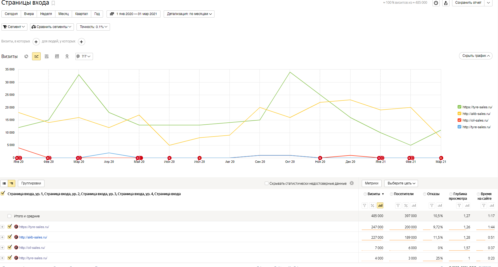 История изменений параметров сайта