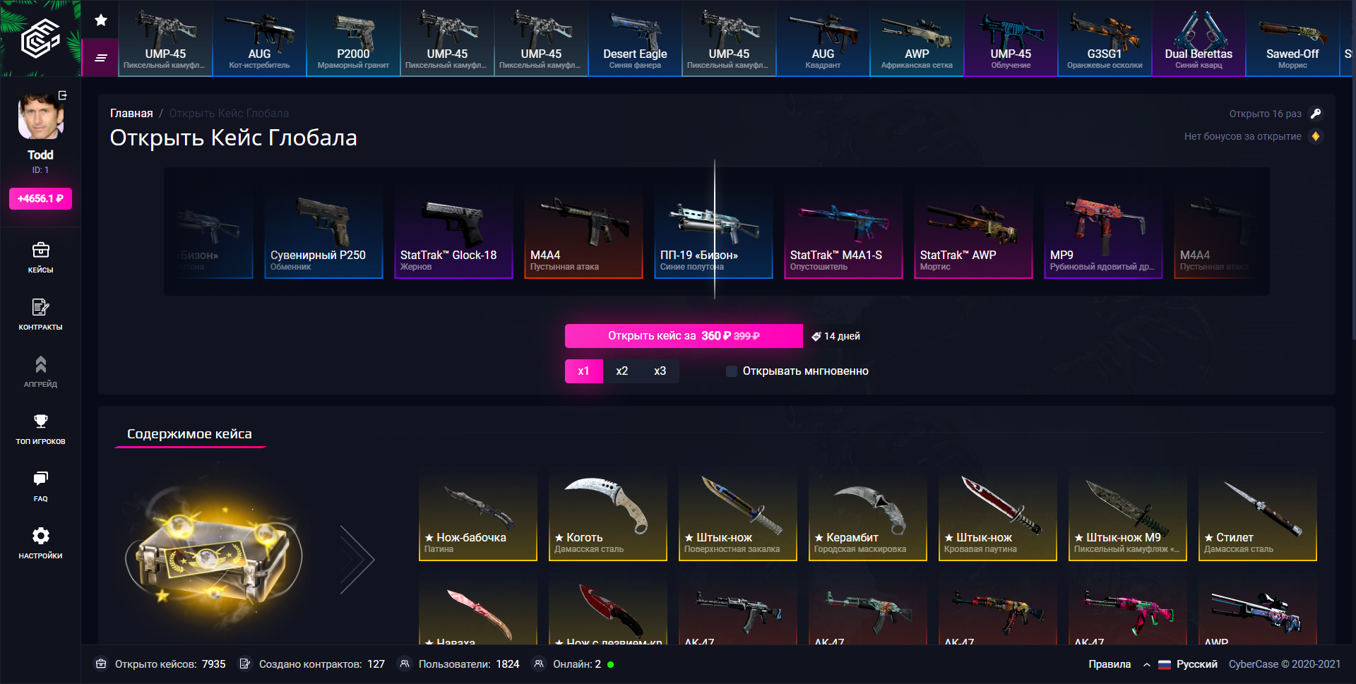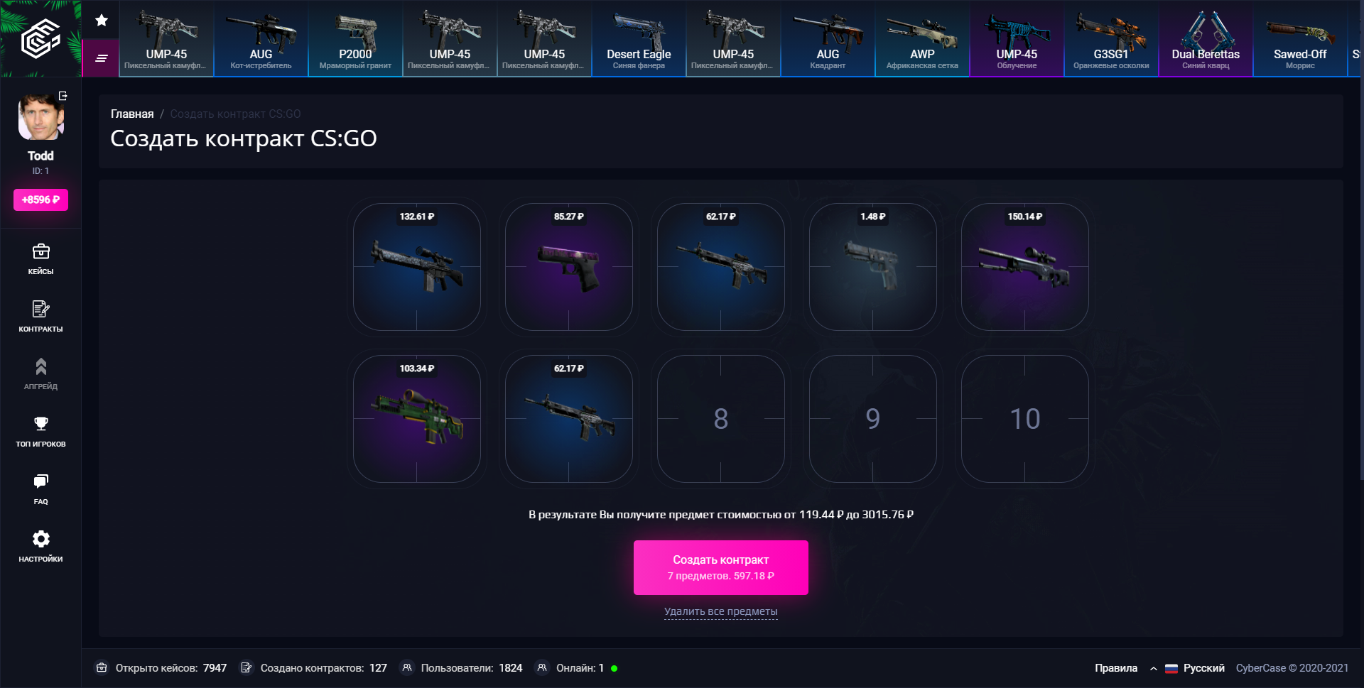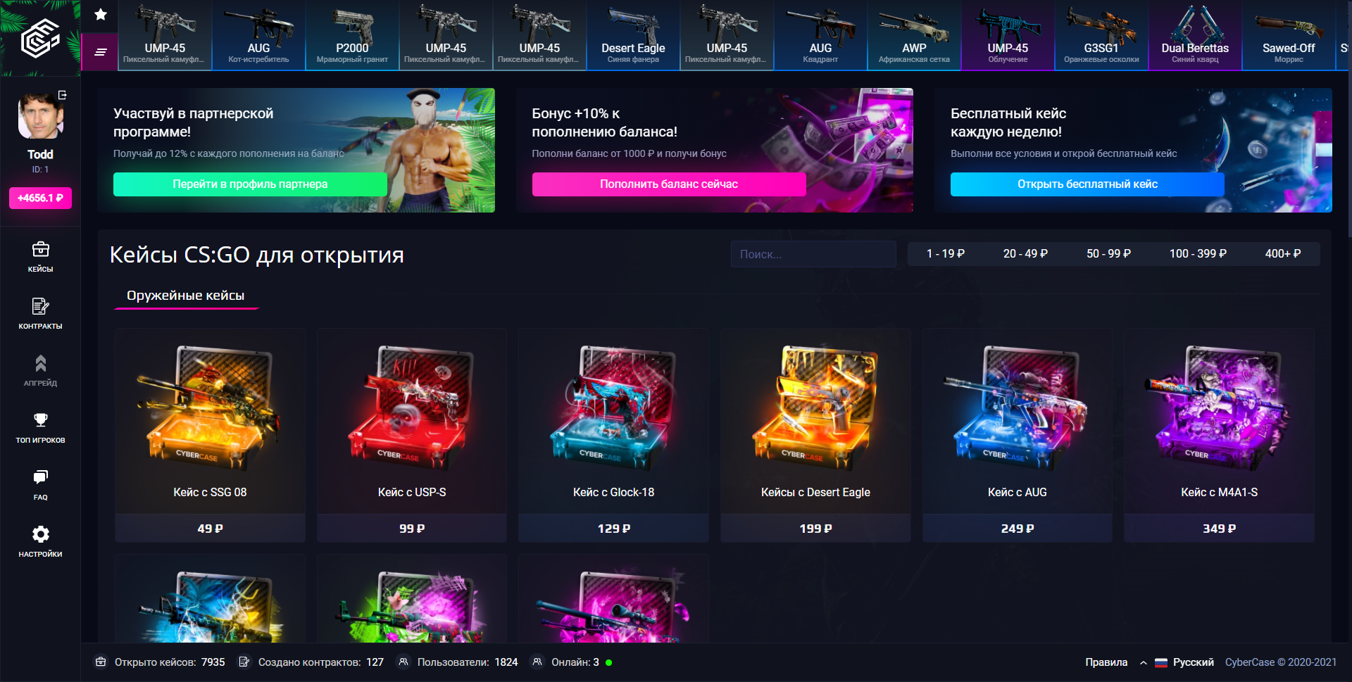 Готовый сайт по открытию кейсов и контрактов CS:GO под ключ. Способен приносить высокий доход после проведения успешной рекламной кампании (например, при привлечении ютуберов/стримеров).