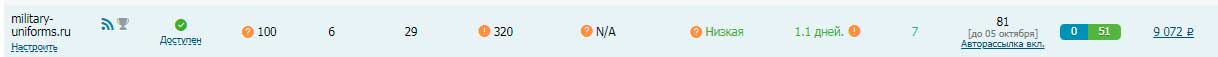 Расходы на хостинг небольшие, так как сайт располагается с другими на одном аккаунте. Примерно рублей 50 в месяц. Заказан нагон сквозных ссылок на сапе для увеличения тф-цф, его можно отключить в случае необходимости. При переоформлении домена регистратор взимает 490 рублей с покупателя единовременно.