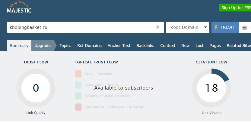 Дроп. Сбор продуктовой корзины с полезными рецептами. Отличное доменное имя. ИКС 20. Показатели Majestic.jpg TF - 0, CF – 18