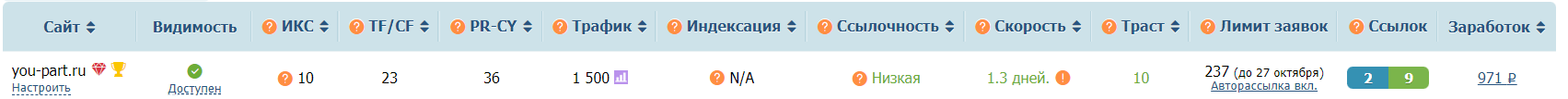 Юридический портал Трафик накручен для ссылочных бирж. Посещаемость 1500/сутки (кручу и симилар и ЯМ), ИКС 10, ТФ/ЦФ 23 (свой, не накрученный), ссылочность низкая. Зарегистрирован в гогетлинкс, в других биржах не регистрировала, так как нет времени им заниматься.