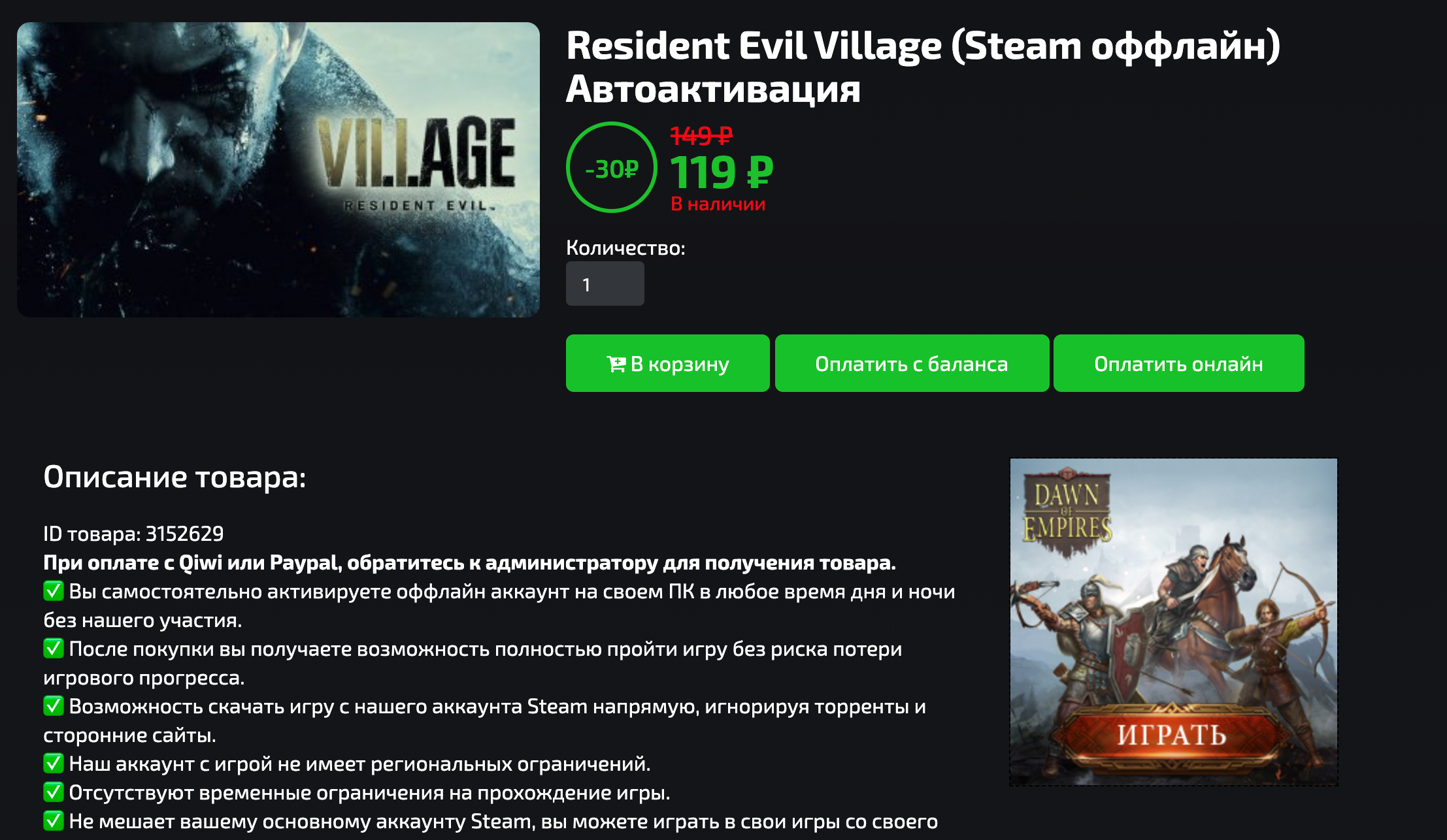 Продаю свой интернет бизнес, так сказать отрываю от сердца(в сайт много было вложено денег, времени и сил). Проект действительно получился крутым, поскольку здесь есть все необходимое для пользователей, именно поэтому он им так нравится. И так, сайт имеет неплохой дизайн, для пользователей есть полностью настроенная система покупок (добавить товар в корзину, оплатить товар онлайн или с помощью баланса аккаунта), кроме того пользователь может легко связаться с администратором с помощью формы обратной связи или телеграмма (добавлен для удобства геймеров), который есть почти у каждого. По-мимо всего на сайте есть два БОЛЬШИХ бонуса, это промокоды, которые можно раздавать после покупки (таким образом покупатель возвращается снова), и это реферальная программа, система приглашения других пользователей (друзей или знакомых) на сайт, на данный момент она выставлена на 10% (при желании можно повысить или понизить). Также можно вывести или внести деньги, по мимо этого можно написать отзыв, добавлять товары в корзину и многое другое. Данный проект имеет довольно много разных функций для пользователей (в проект вложено много времени, денег и сил). Также сейчас был немного изменен домен сайта, хотя по ключевым словам из поисковиков сайт спокойно находят (работает редирект), поэтому не удивляйтесь что сейчас икс сайта 0, скоро из за редиректа и рекламы он опять вырастит