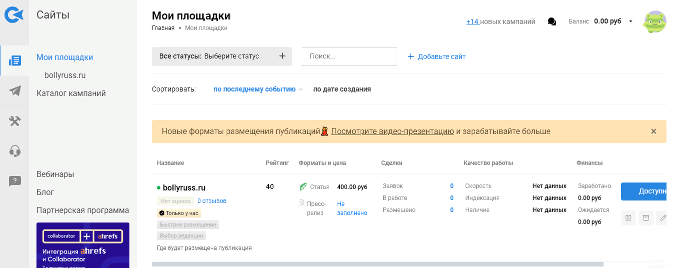 Также недавно добавил сайт в GoGetLinks и Collaborator.