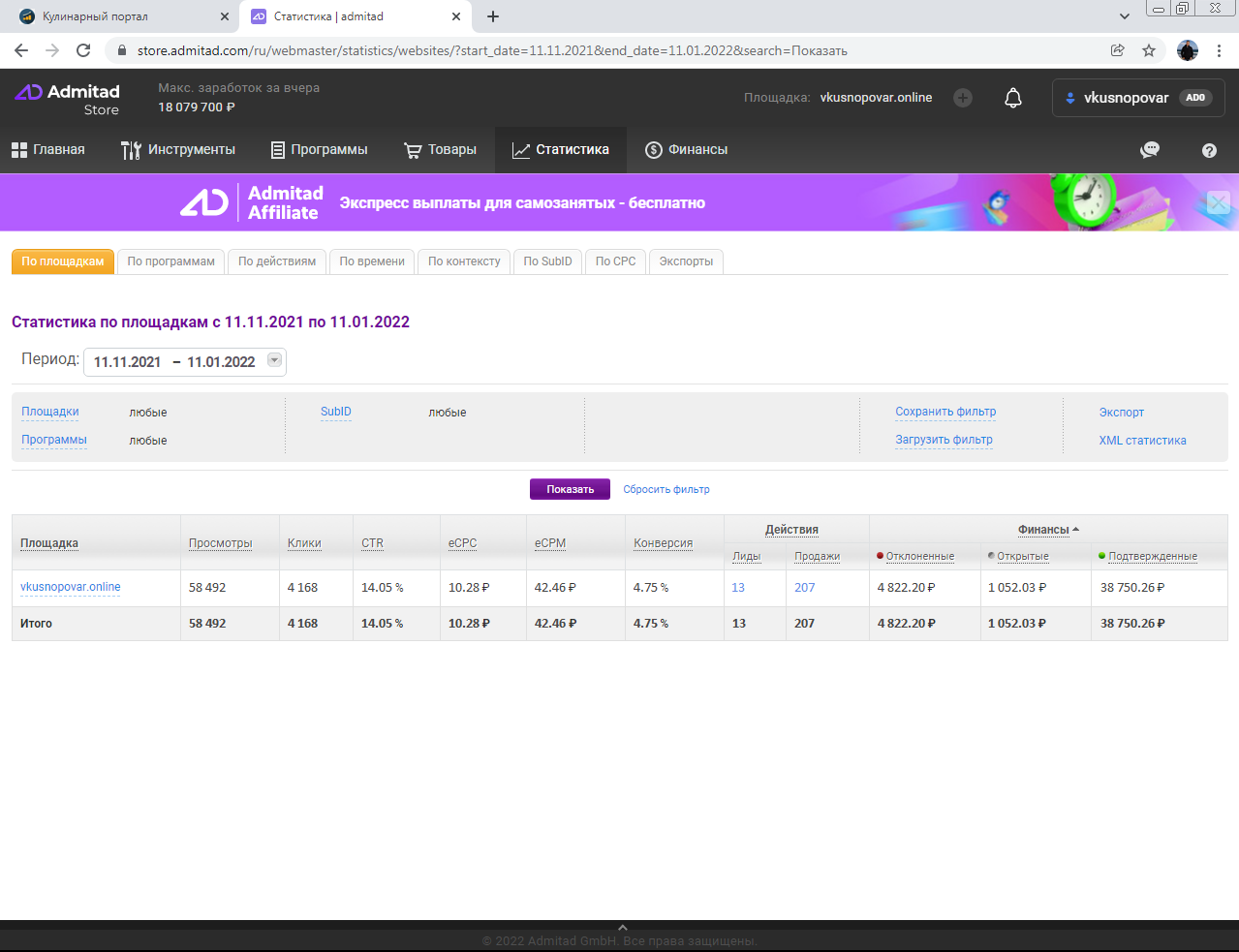 Пассивный доход с компании admitad.com. За последние два месяца в сумме он составил 38750 рублей