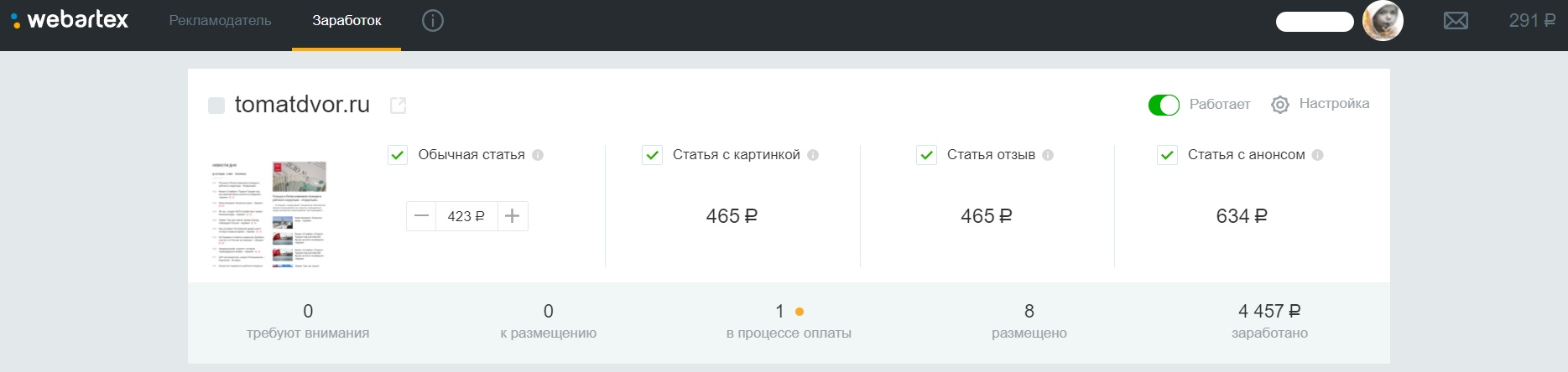 Сайт работает на биржах которые приносят стабильный доход, так же есть прямые заказчики на публикацию статей, постов, ссылок, баннеров на сайте. Данные люди связываются на прямую с администрацией сайта..