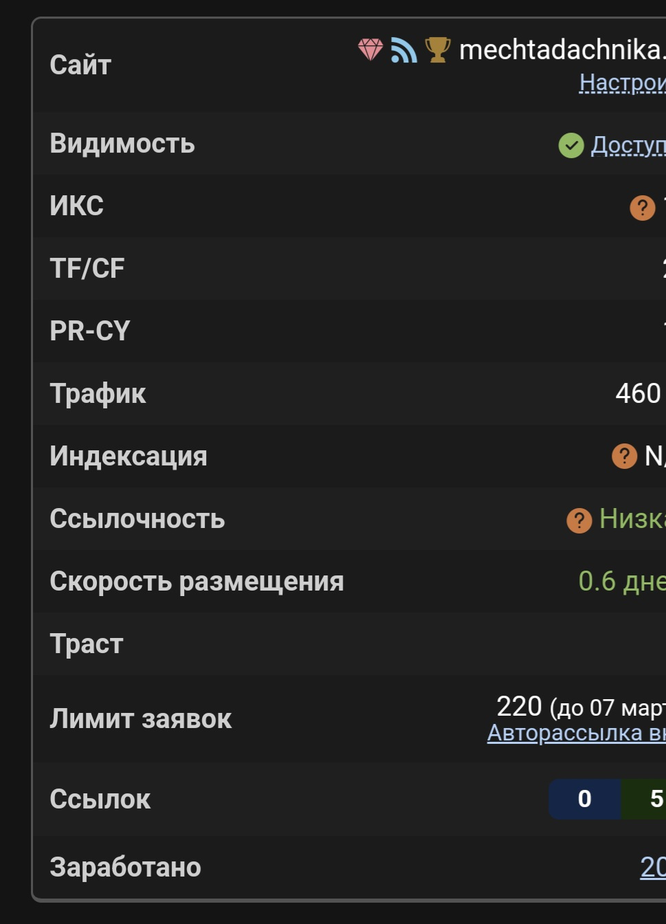 Сайт недавно добавлен на биржу ГГЛ. Уже есть регулярные заявки и их число с приближением сезона дачных работ будет только расти. К тому же можно подать сайт в другие биржи и подключить рекламу, как партнёров, так и Адсенс и РСЯ