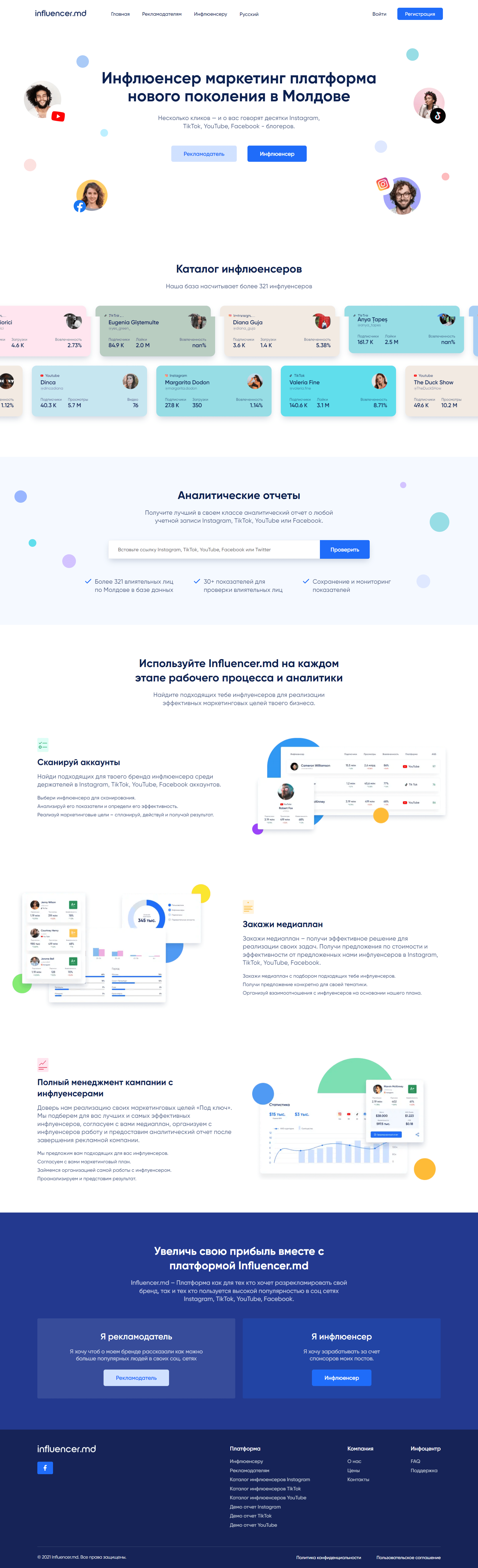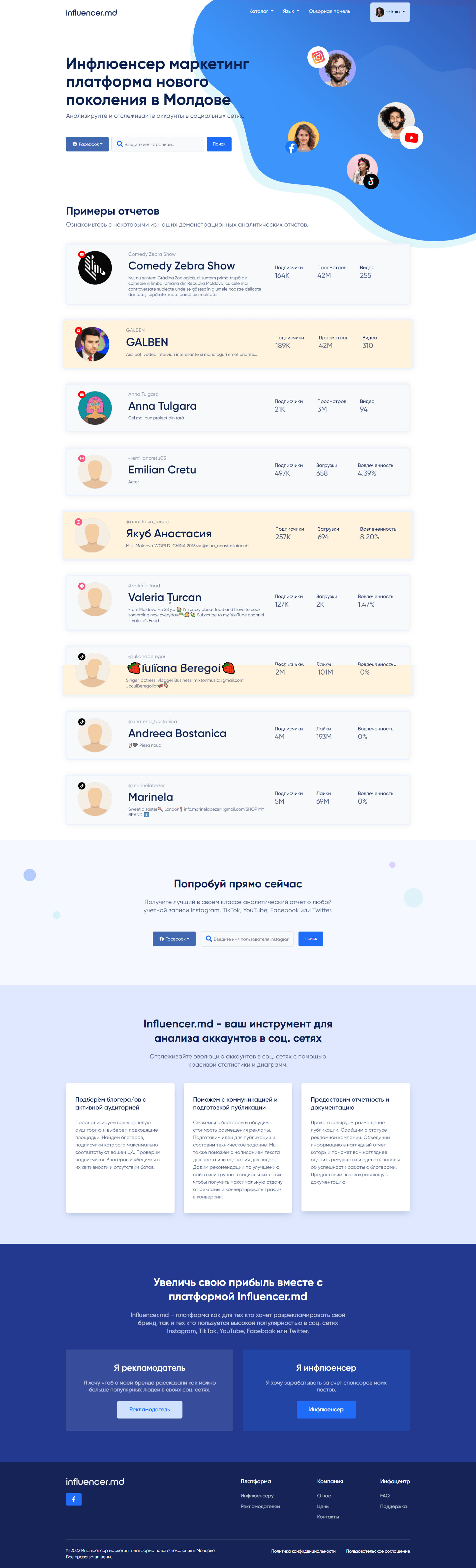 Этот проект сканирует аккаунты инфлюенсеров в Instagram, TikTok, YouTube и Facebook и подбирает аналитические данные. Для чего скажите вы ? Для рекламного сотрудничества между рекламодателями и инфленсерами.