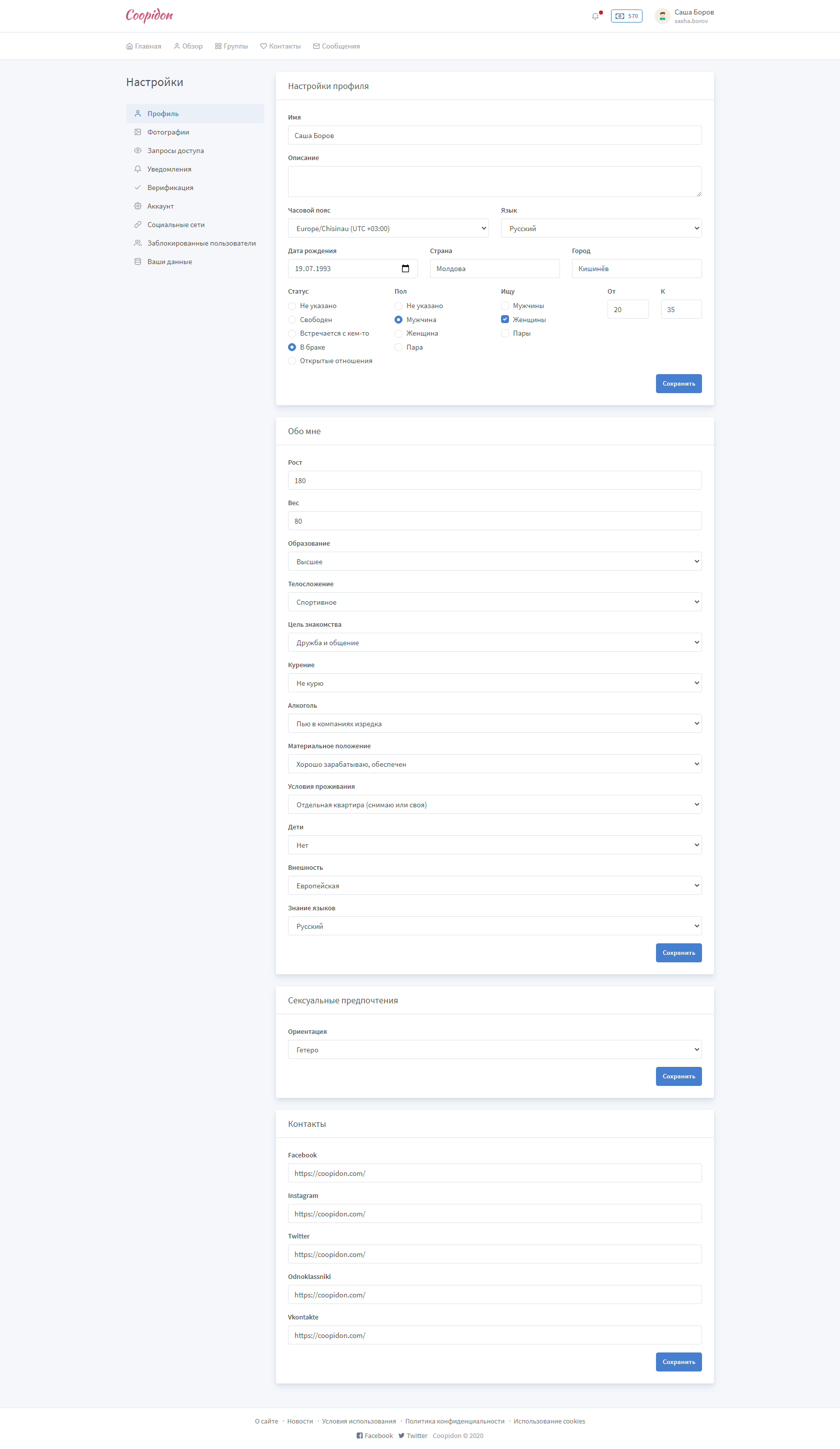 Этот сайт легко можно переделывать под обычный сайт для знакомства или даже под соц. сеть.
