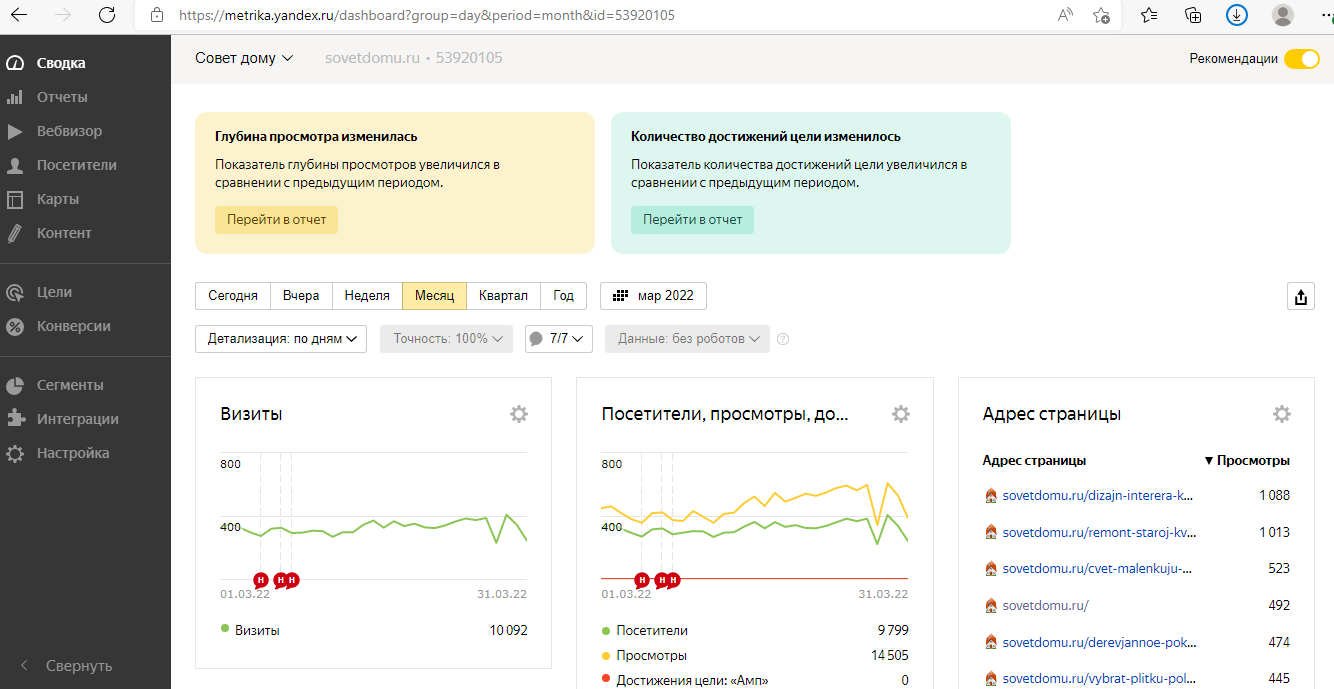 Вспомнила, что доступ ЯМ мне еще открывал предыдущий хозяин, пыталась с ним связаться, но он не выходит на связь, поэтому переделала ЯМ на себя только 02.04.2022, показатели будут так скажем совсем свежие. Для понимания полной картины по сайту наделала скриншотов с показателями предыдущей ЯМ.