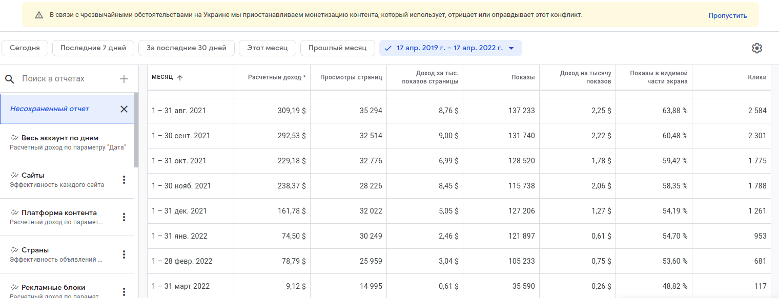 В среднем сайт на протяжении всех лет приносил Google - 80-100$ и РСЯ - 40-60$, были периоды когда гугл приносил в месяц больше 300$ , посещаемость бывает растет до 2000-2500 тысяч в день.
