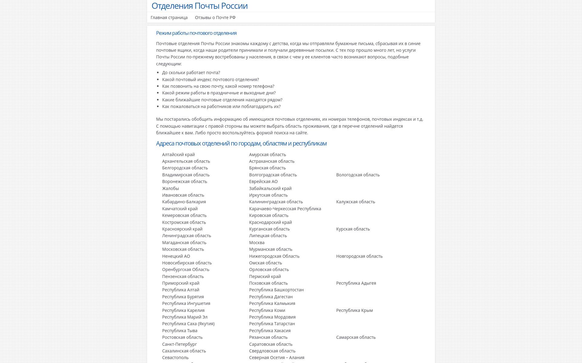Po-chta.ru предоставляет подробную информацию о почтовых отделениях "Почты России". Пользователи могут узнать режим работы, контактные телефоны, почтовые индексы и даже ближайшее расположение отделения по городам и регионам.