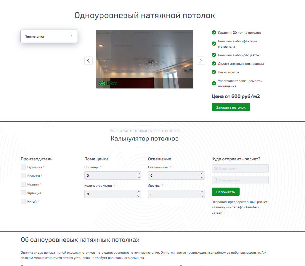 Сайт изготовлен на популярной платформе Wordpress с легким административным управлением и современным дизайном. На сайте более 500 страниц, которые находятся в индексе поисковых систем. Каждая страница оптимизирована под seo-продвижение (заголовки, уникальные тексты). Самая широкая структура среди конкурентов (наибольшее количество разных категорий), которая позволит найти клиента под любой запрос. При необходимости предоставим помощь в редактировании страниц под запросы покупателя. Делался под свой проект потолков. При продаже расскажу как дальше продвигать и распишу план продвижения сайта