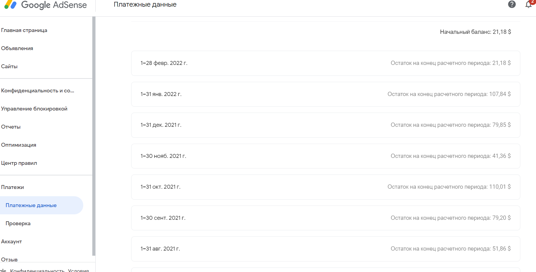 - заработок в Гугл Адсенс до конца февраля 2022г составлял в среднем 30$/месяц, перед Новым годом 40$/месяц, выплаты в аккаунте были.