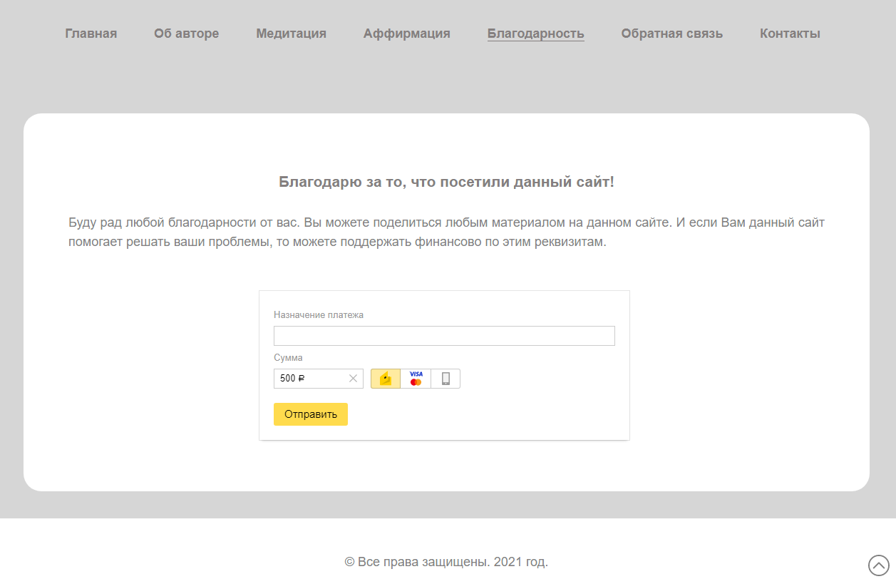 Данный сайт подойдет для мастера Рэйки, медитации или тем, кто связан c нишей духовного роста, саморазвития, а так же преподавателю духовных дисциплин. От меня помощь в замене контента на ваш, если он имеется.