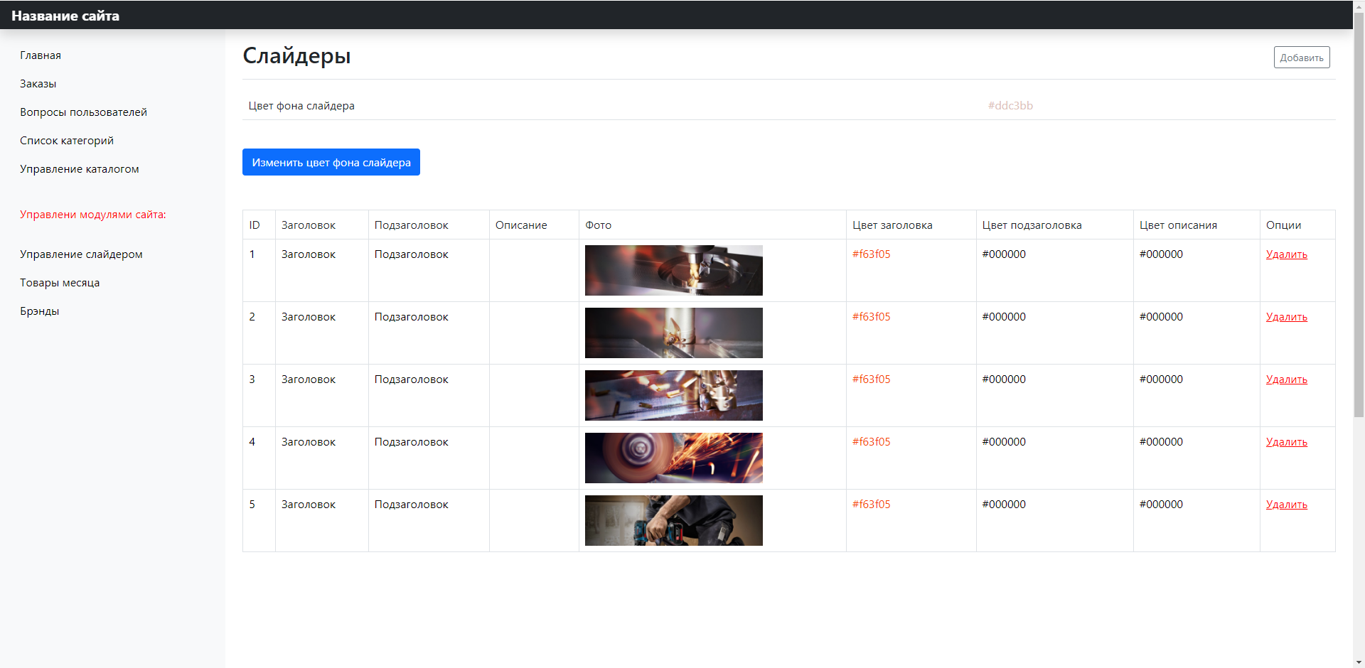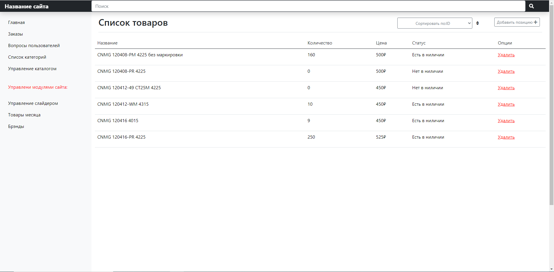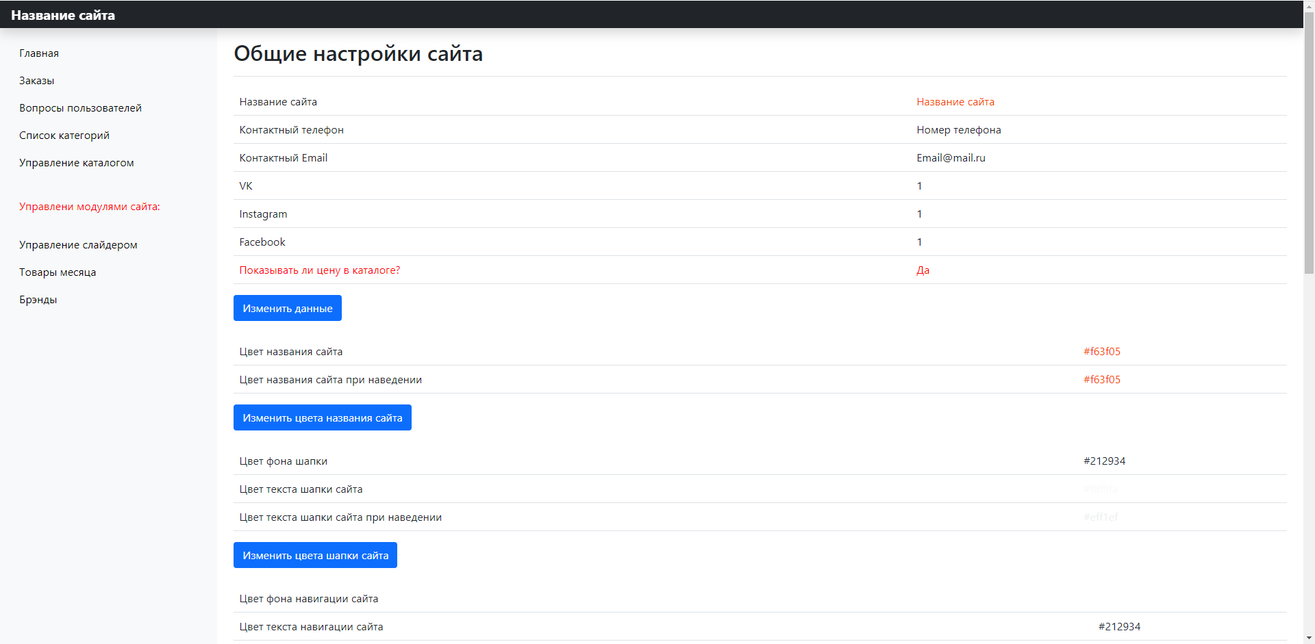 Панель администратора, через которую вы можете настроить внешний вид вашего сайта ,наполнить его товарами, указать контактные данные, управлять заказами ваших и отвечать на вопросы ваших клиентов.