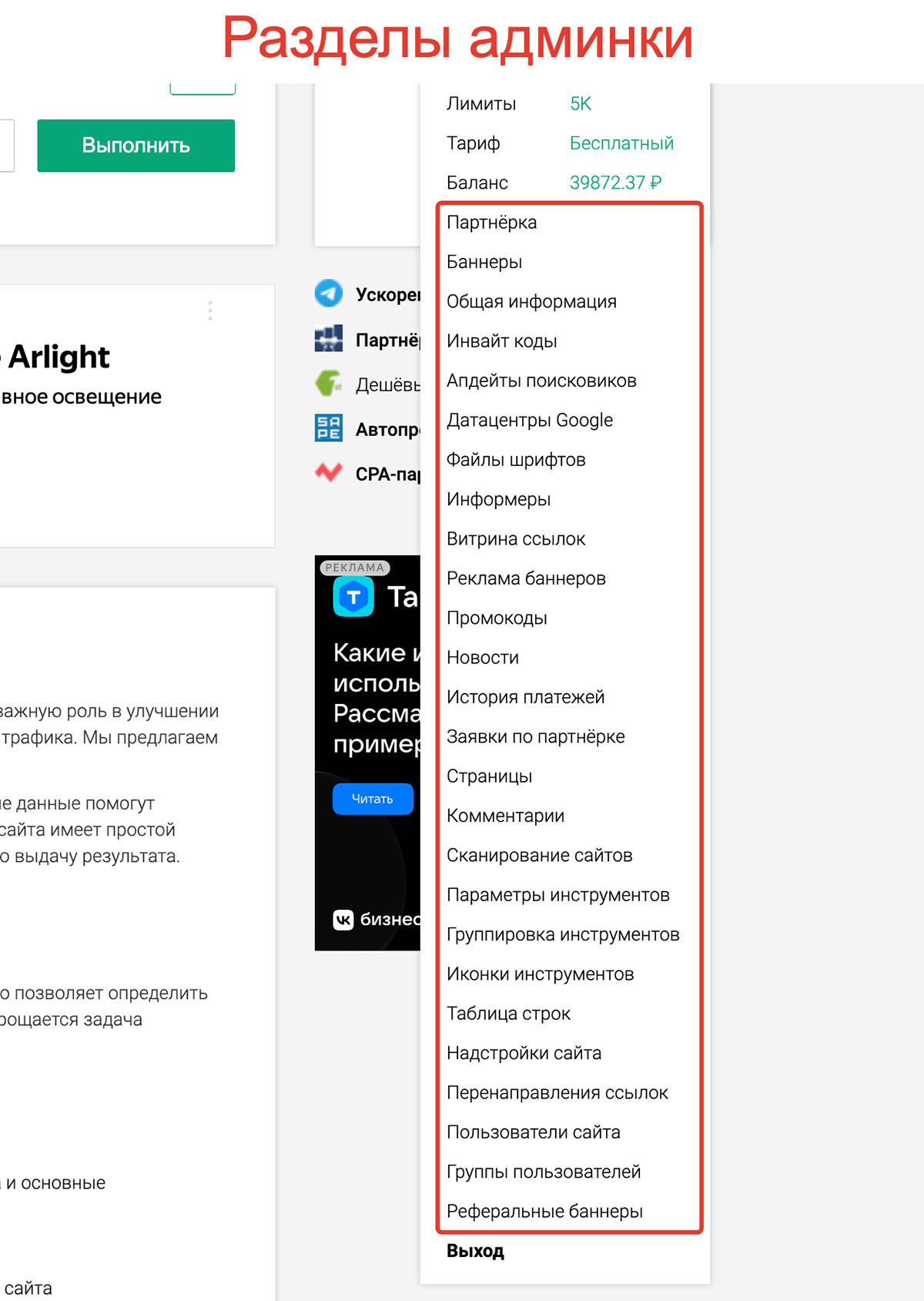 - и многое другое (см. скриншот "Разделы админки").