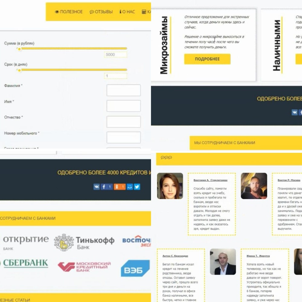 + БОНУСОМ: 7 витрин МФО на html - дизайн витрин смотрите в прикреплённых скриншотах. Можно их использовать в арбитраже трафика, а также продавать как отдельные сайты, или делать витрины за 5 минут на фриланс-биржах и брать за это от 1000 рублей за заказ.