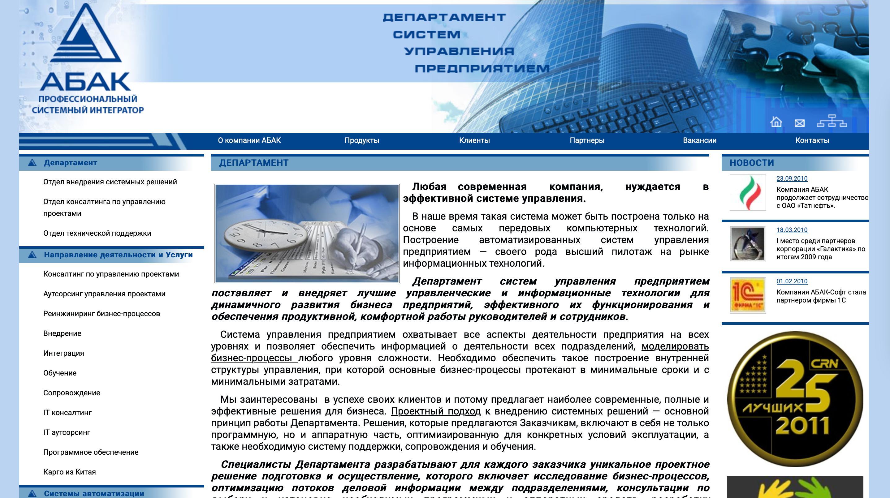 Сайт известного и крупного системного интегратора Абак в Казани. Компания собрала себе новый сайт на новом домене. Этот забыли продлить. Так как ранее мы разрабатывали этот старый сайт для них, то подобрали домен и восстановили сайт из своего же архива.