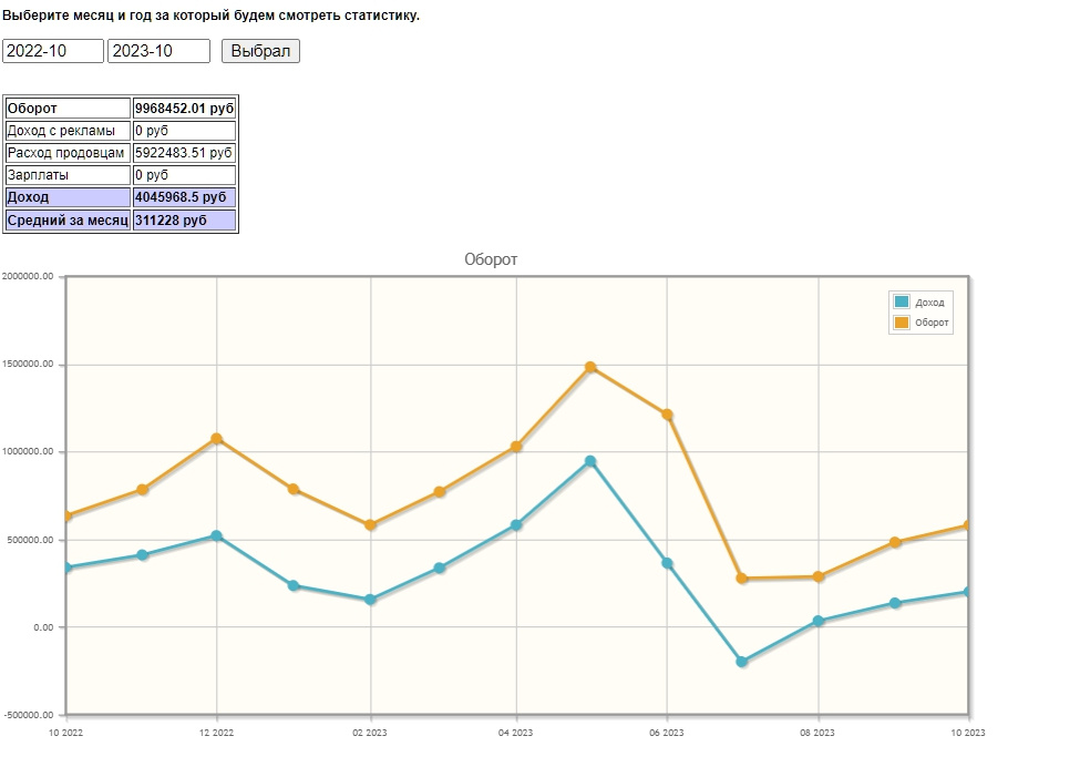 Доход в среднем 300 000 месяц и каждый год подрастает. Доход это чистый доход за вычетом выплат продавцам. Я приложил скрин графика оборота и дохода. На нём можно посмотреть оборот и доход по месяцам.