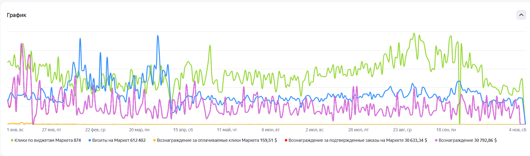 Есть выгрузка с Яндекс.Дистрибуции за 10 месяцев 2023 года (611447 визитов и 30792 USD дохода).