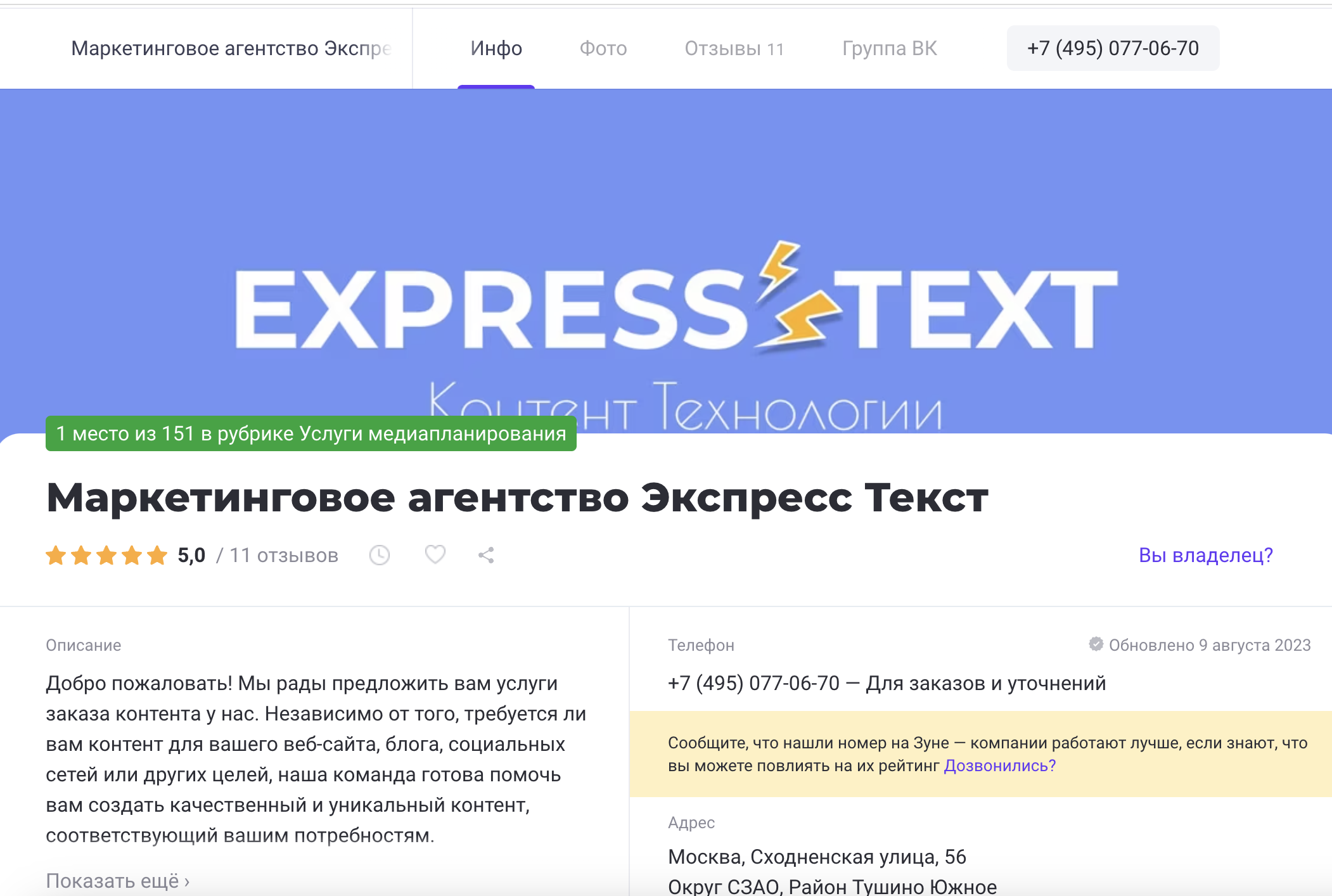 Продаю готовый бизнес: агентство по копирайтингу и медиапланированию ЭКСПРЕСС ТЕКСТ которая в ТОП1 в ZOON в категории "Медиапланирование" и PR органически, без платных услуг zoon
