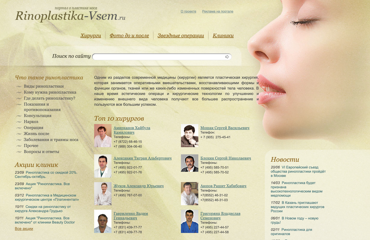 Портал о ринопластике и пластической хирургии лица. Содержит информацию о хирургах, клиниках, методах лечения, статьи, отзывы. Собран на html, код оптимизирован и вычищен от лишнего кода.