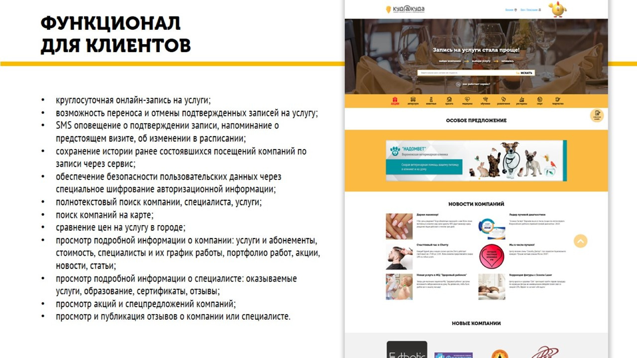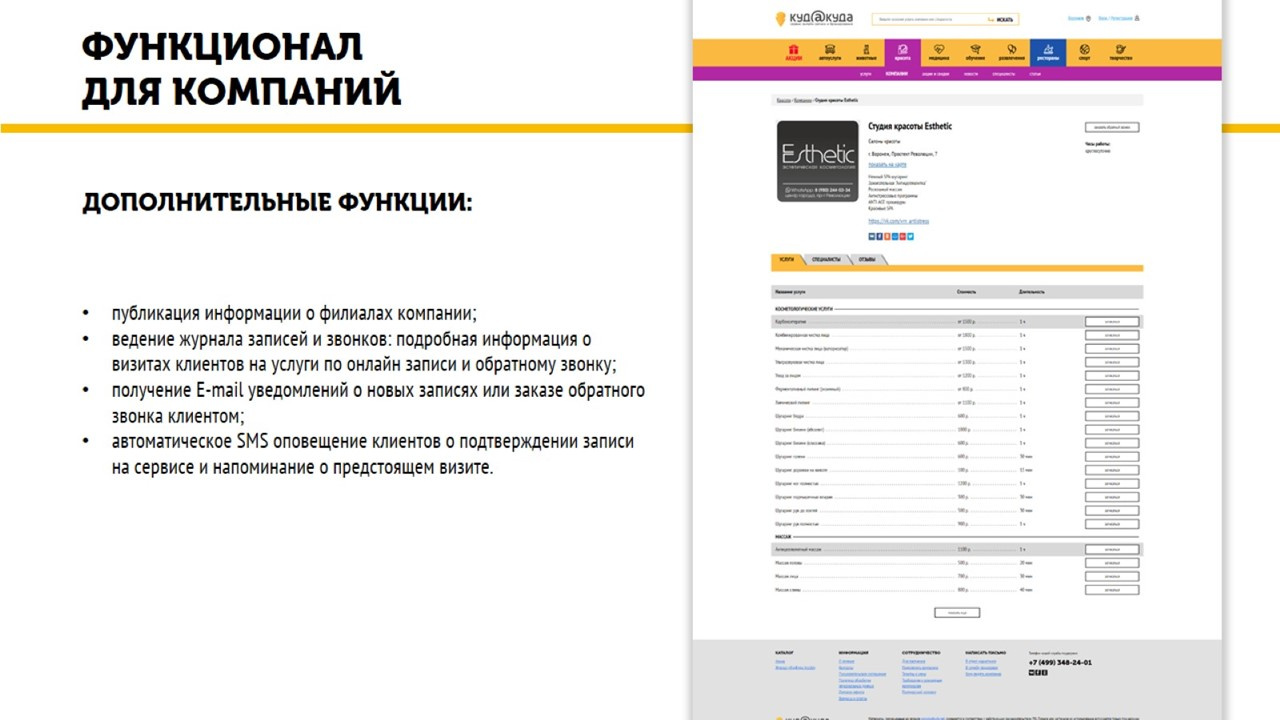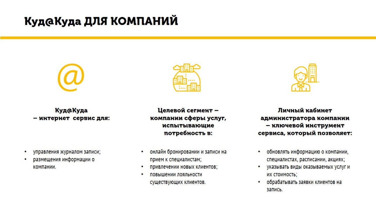 Для компаний преимущества использования сервиса Куд@Куда очевидны: расширение рекламных возможностей, привлечение новых клиентов, увеличение выручки, улучшение имиджа предприятия. В то же время для пользователей сервис предлагает удобный и быстрый способ найти нужную компанию, самостоятельно записаться на услуги в удобное время, получить уведомления о визите, а также сравнить цены и выбрать оптимальное предложение.