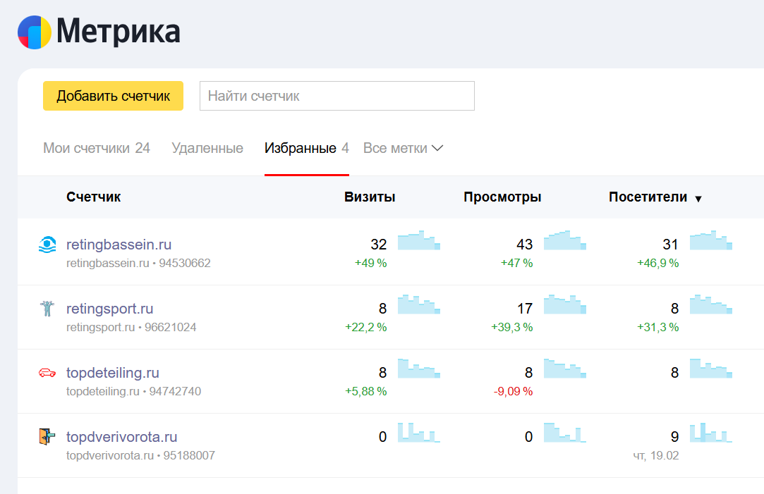 Основной сайт каталог бассейнов по всей России с разделом статей по теме плавания и бассейнов. Плюс к нему бонусом отдам еще 3 такого же типа только другая тематика (спорт, детейлинг, каталог магазинов дверей и ворот). Прикрепила скрин из Метрики со всеми сайтами.