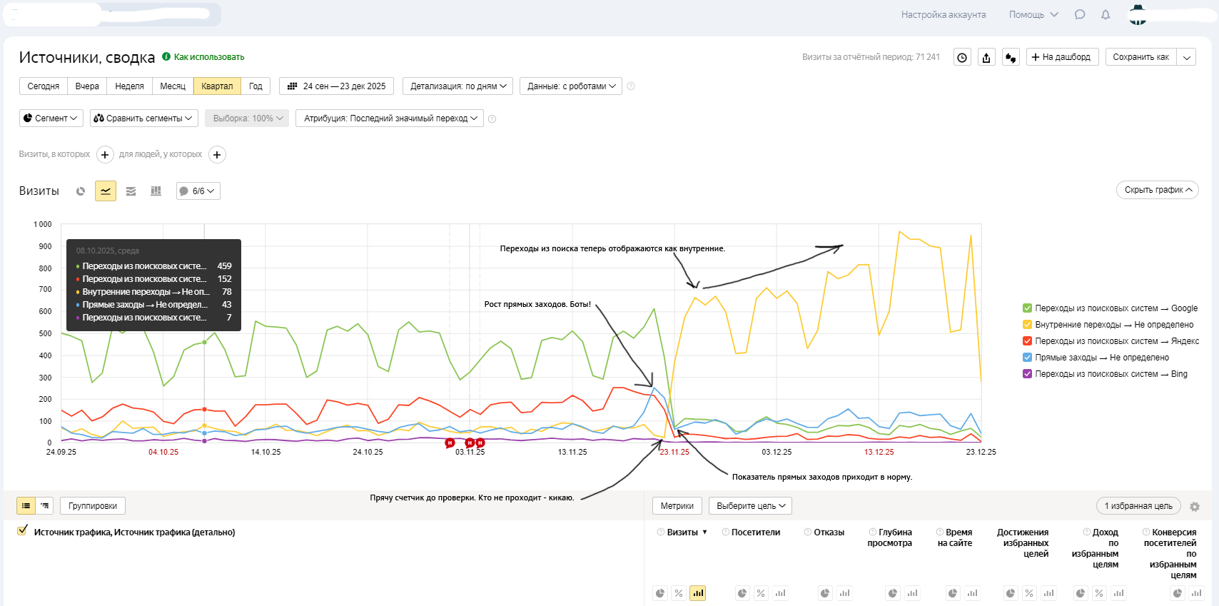 UPD. В источниках большой показатель "иные источники". На самом деле это поисковый трафик. Просто на сайте стоит скрипт проверки на ботов и счетчик метрики не загружается до тех пор пока пользователь не пройдет js проверку, потому в метрике он отображается как внутренний переход. Боты такую проверку не проходят и сервер их кикает с 403 error.