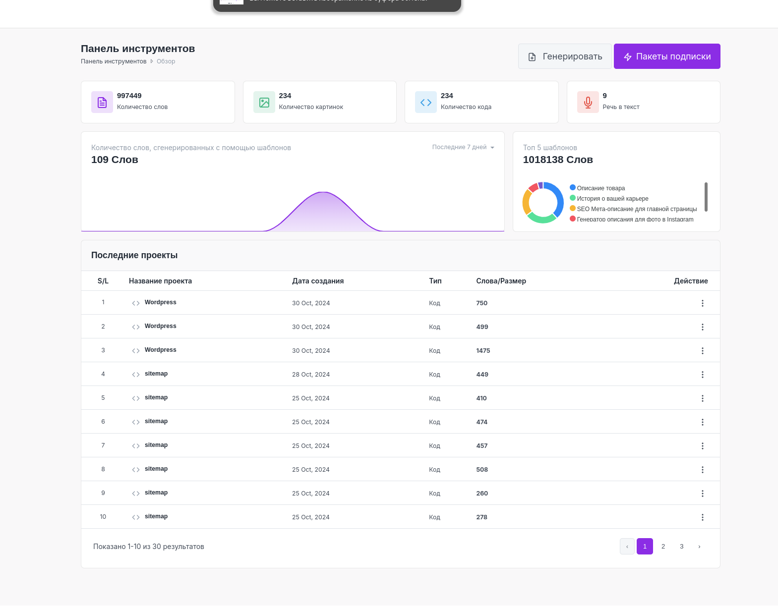 - На сайте есть готовые шаблоны для генерации контента (SEO описание для сайта, название для товара, генерация рекламного объявления и т.д) - шаблонов более 30 шт.