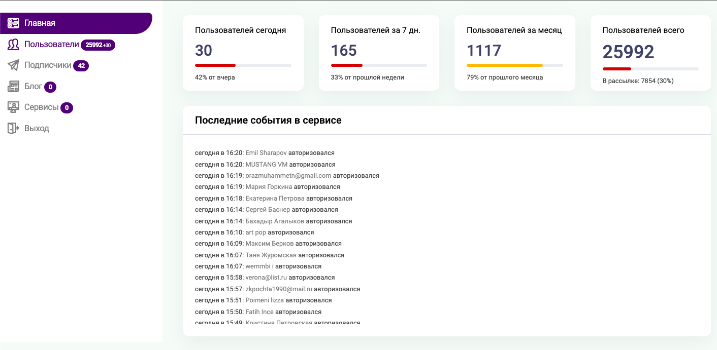 На сайте реализован личный кабинет и подписка на рассылку. На момент публикации в базе 26 тысяч пользователей, из которых 7850 подтвердили почту и согласились на рассылки. Также осенью был запущен бот в Тг, но пока не был анонсирован пользователям сайта. В него пришли с поиска около 40 человек без рекламы.